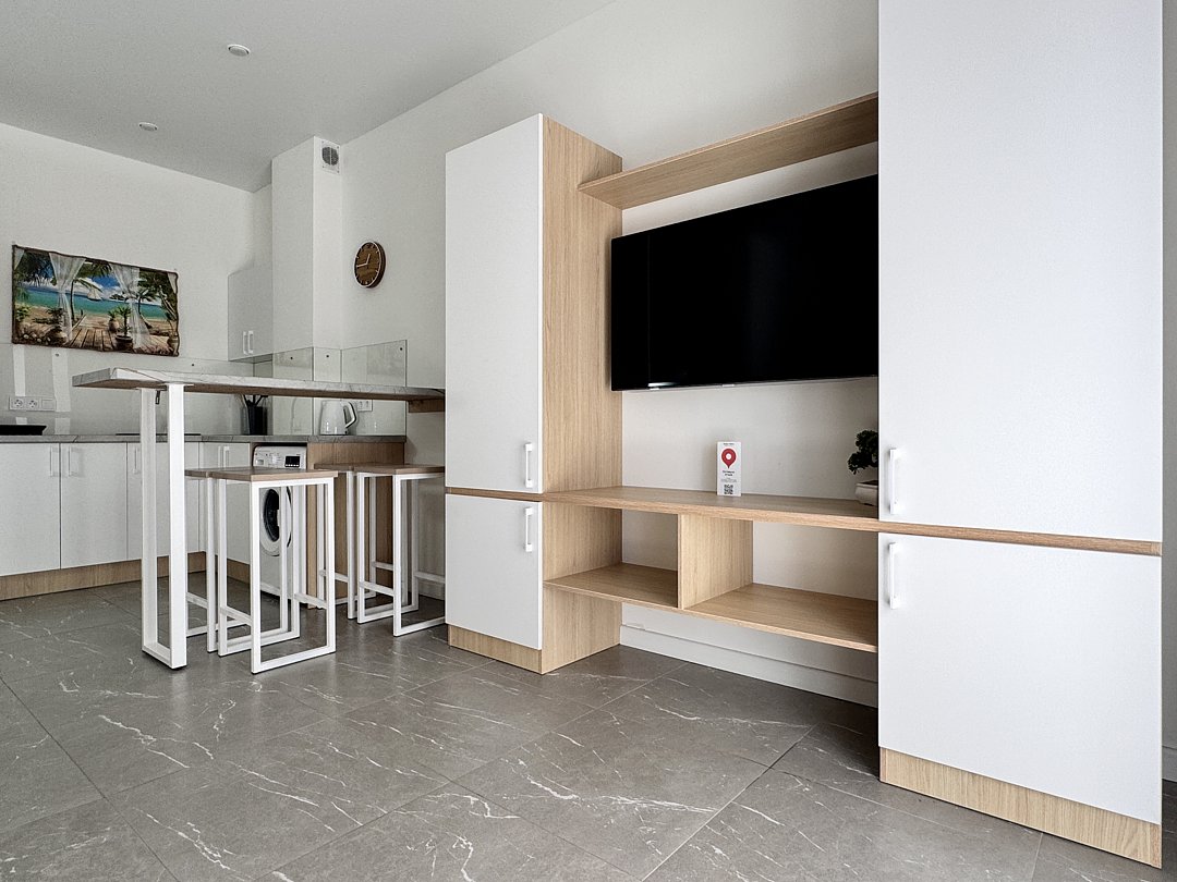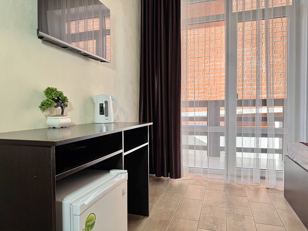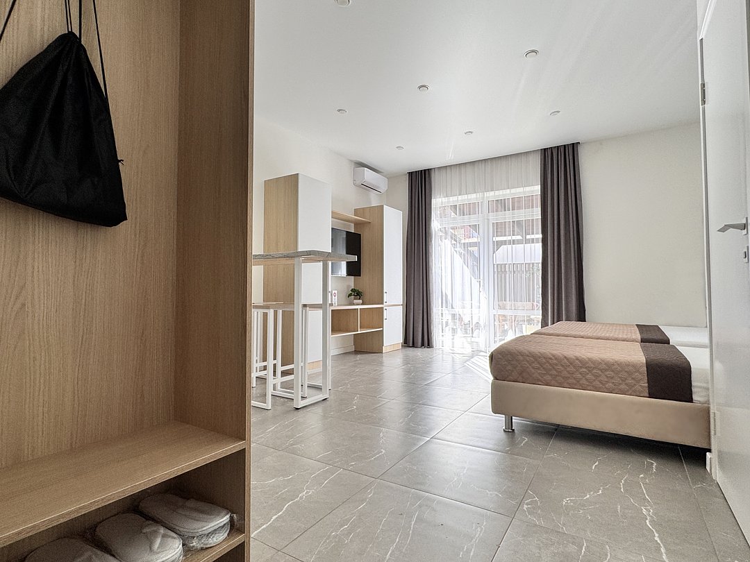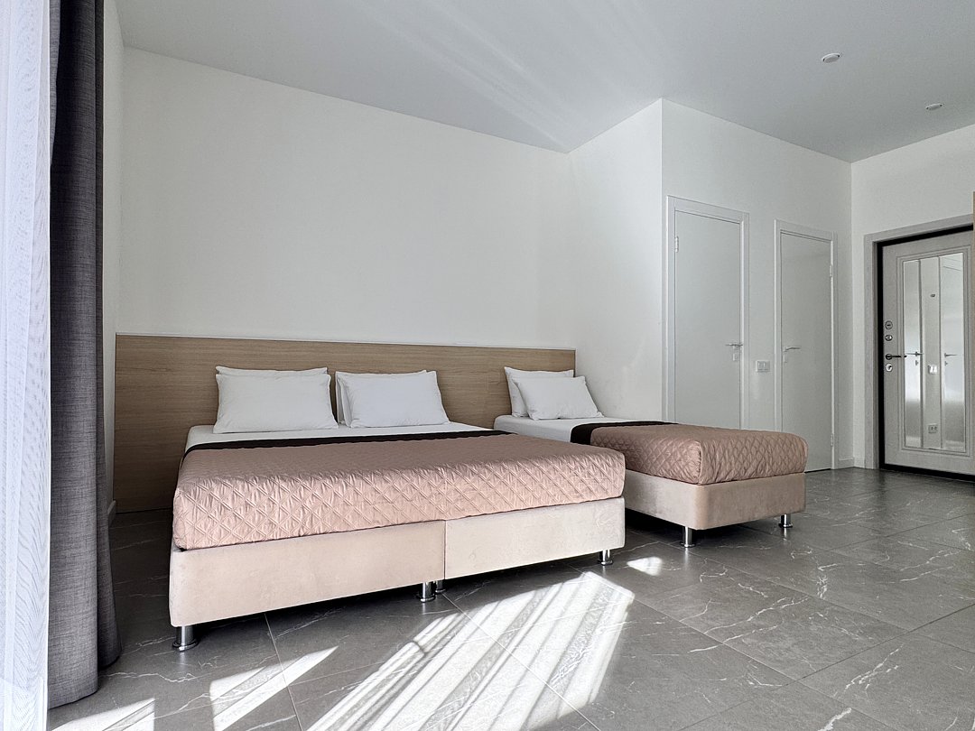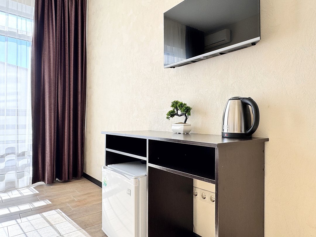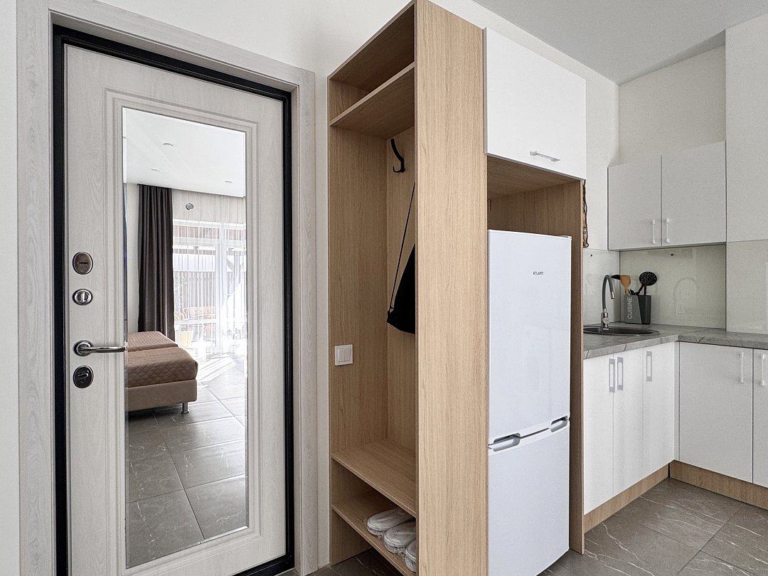 Просторная студия с зоной отдыха возле номера. Кухонный уголок: одноконфорочная индукционная плита, холодильник с морозильной камерой, мойка, посуда для приготовления пищи (кастрюли, сковорода, кухонные принадлежности), посуда для приема пищи (тарелки, кружки, стаканы, столовые приборы); барная стойка, стулья; стиральная машина. Спальная зона: двуспальная кровать, односпальная кровать; шкаф, вешалка, телевизор, кондиционер; шторы блэк-аут. Раздельный санузел. Душ, комплект полотенец, тапочки, набор гостиничной косметики. Также возможно размещение доп места в виде евро-раскладушки.