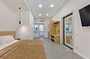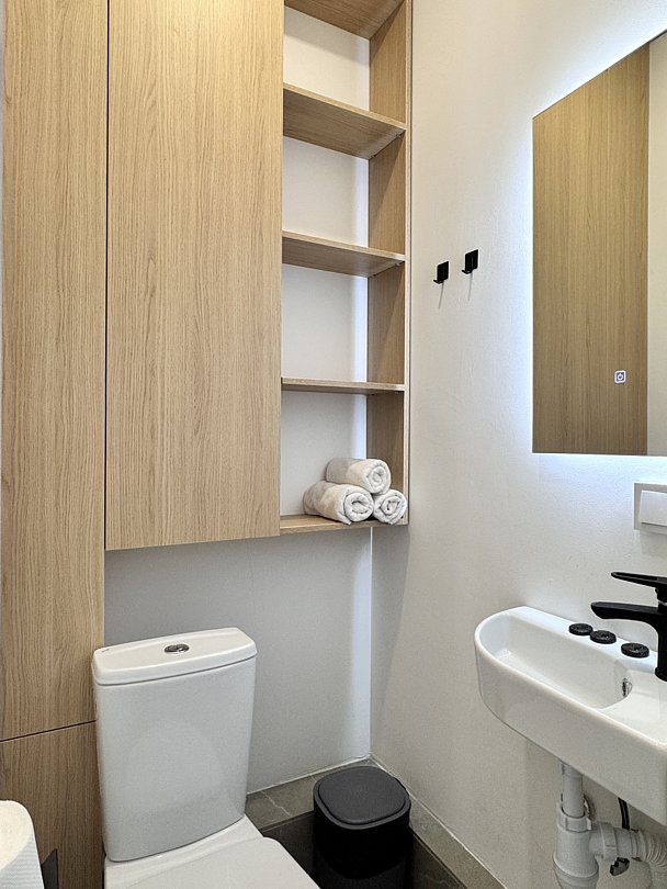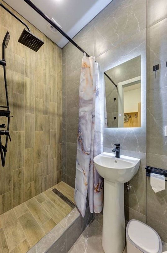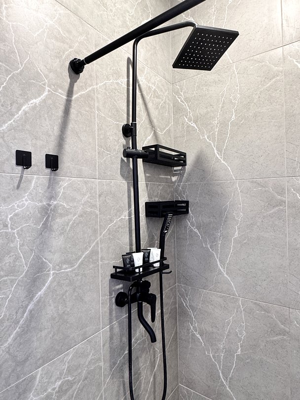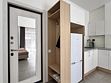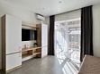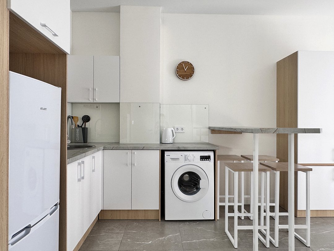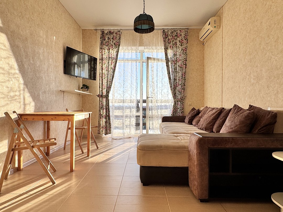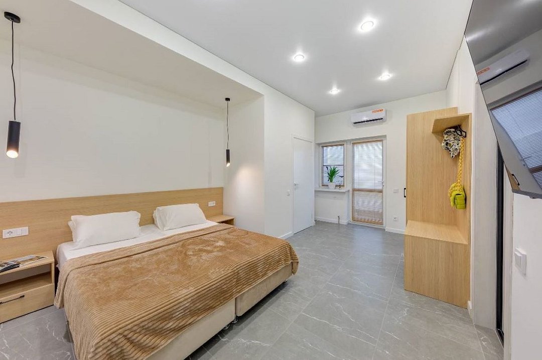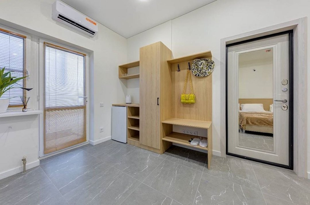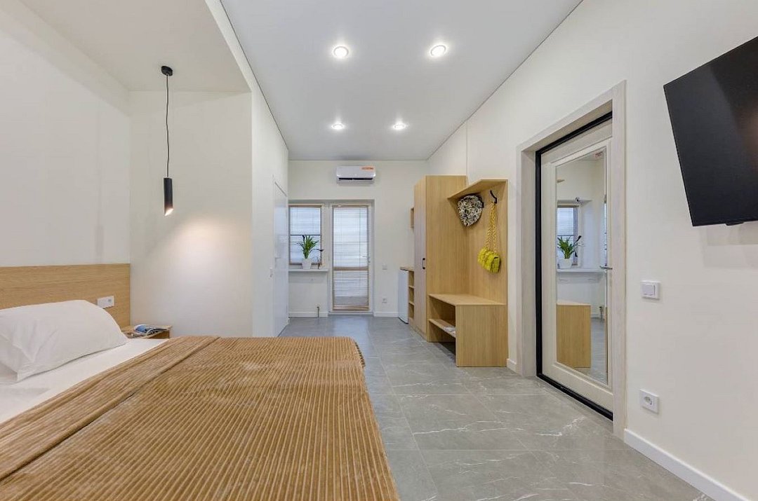 Просторная студия с зоной отдыха возле номера. Кухонный уголок: одноконфорочная индукционная плита, холодильник с морозильной камерой, мойка, посуда для приготовления пищи (кастрюли, сковорода, кухонные принадлежности), посуда для приема пищи (тарелки, кружки, стаканы, столовые приборы); барная стойка, стулья; стиральная машина. Спальная зона: двуспальная кровать, односпальная кровать; шкаф, вешалка, телевизор, кондиционер; шторы блэк-аут. Раздельный санузел. Душ, комплект полотенец, тапочки, набор гостиничной косметики. Также возможно размещение доп места в виде евро-раскладушки.