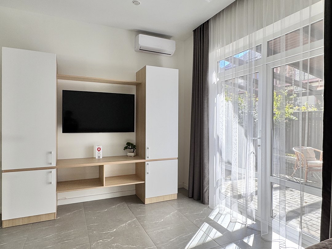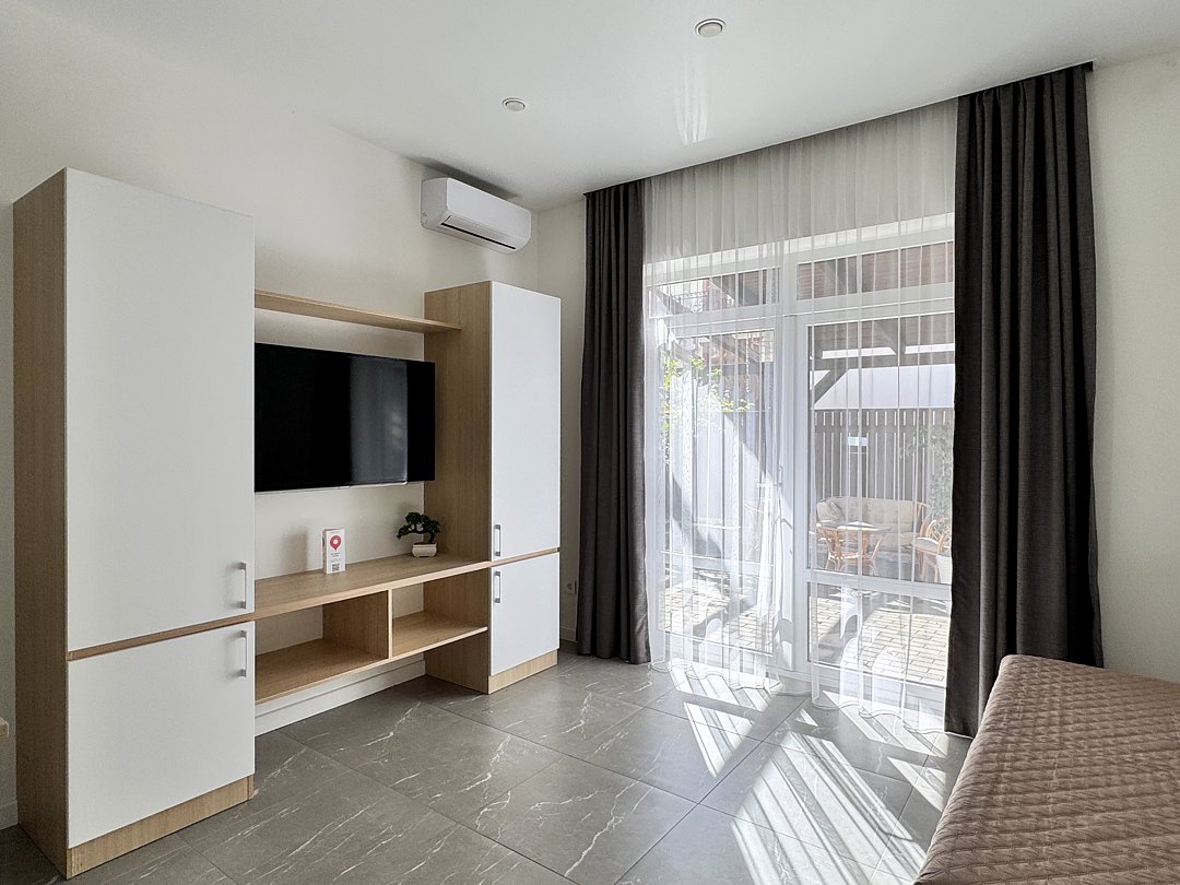 Уютный номер на первом этаже с зоной отдыха возле номера. В номере имеется двуспальная кровать, прикроватный тумбочки, прикроватные светильники, кресло-кровать, шкаф, вешалка, зеркало, электрический чайник, мини-холодильник, телевизор, кондиционер. Ванная комната: душ, зеркало, фен, комплект полотенец, тапочки, набор гостиничной косметики. Зона отдыха возле номера.