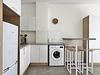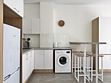 Кухня-гостиная: диван-кровать, обеденная группа (стол, стулья), телевизор, кондиционер; кухонный гарнитур с газовой плитой, вытяжка, электрический чайник, холодильник с морозильной камерой, посуда для приготовления пищи (кастрюли, сковорода, кухонные приборы), посуда для приема пищи (тарелки, кружки, столовые приборы); стиральная машина, сушилка для белья, выход на балкон.