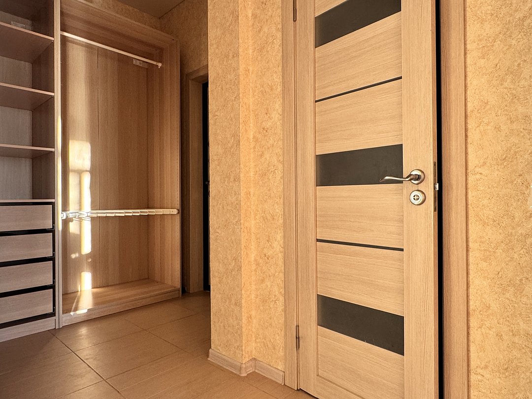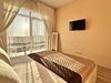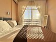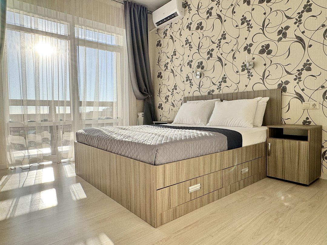 Спальня: двуспальная кровать, с ящиками для хранения вещей, прикроватные тумбочки, светильники-бра над кроватью, розетки возле кроватей; телевизор, кондиционер, шторы блэк-аут. Балкон.