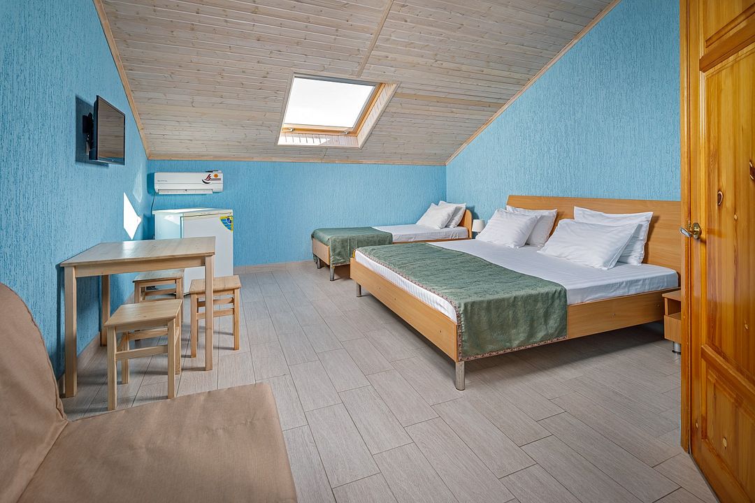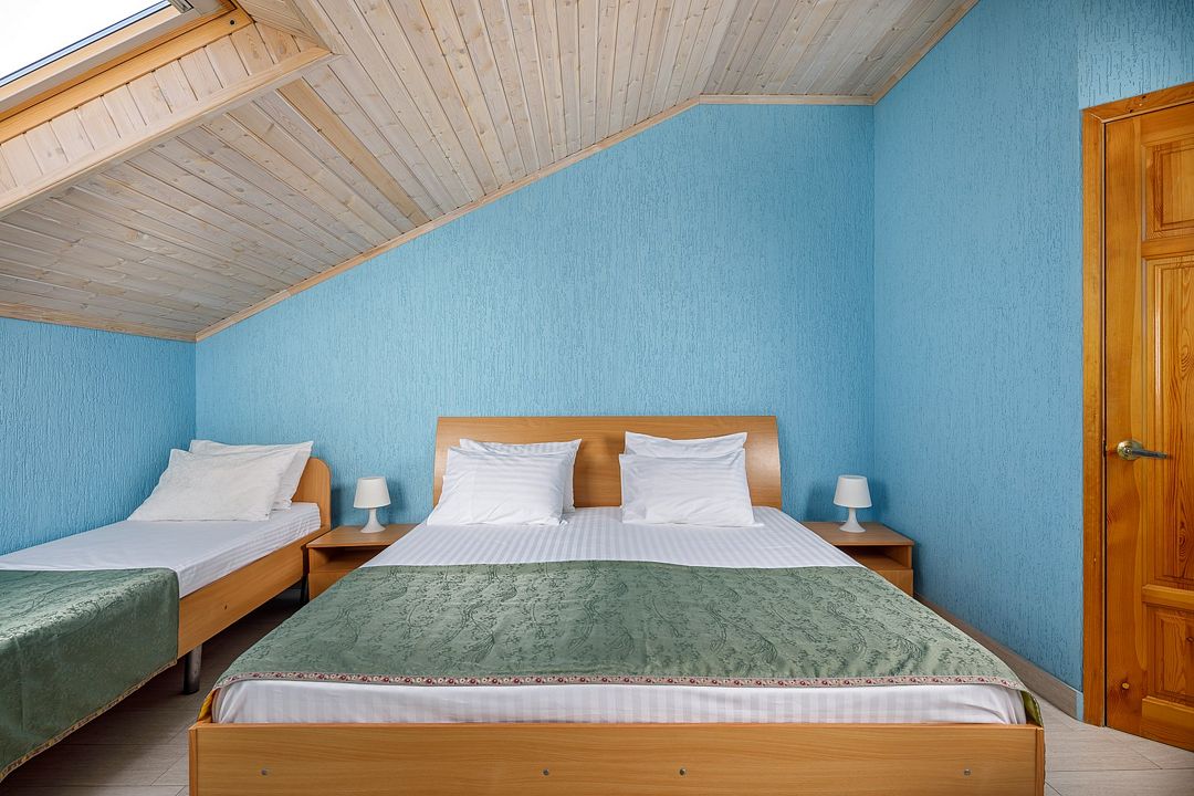 Мансардные номера пользуются все большей популярностью. У многих номер ассоциируется с верхним этажом, но современные методы строительства и внутреннего оснащения позволяют использовать апартаменты с мансардой создавая уникальное чувство уюта. Номер оснащен всеми удобствами для комфортного отдыха как семейной паре так и более численной группе гостей. В номере большая ванная комната с душем и туалетом, холодильник, система кондиционирования, LCD телевизор с цифровыми каналами и usb плеером, двуспальная кровать размера king-size, односпальная кровать и кресло-кровать. Комплект полотенец и мыльные принадлежности на каждого гостя находятся в ванной комнате.Услуги и удобства