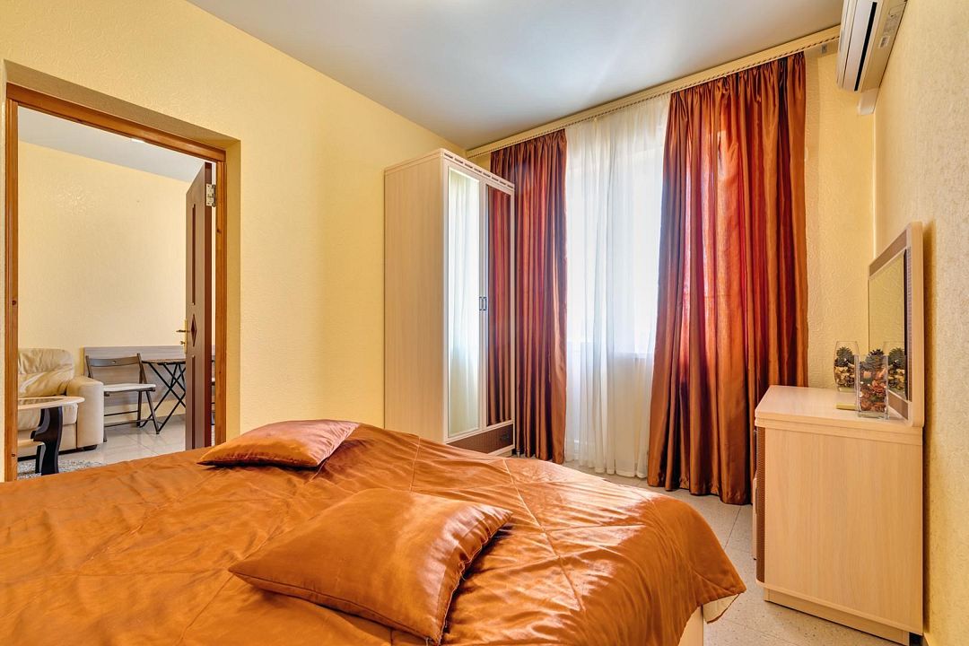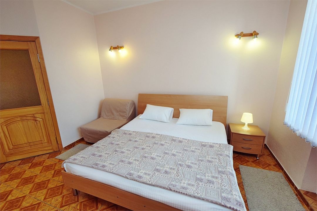Современный однокомнатный номер подойдет для четырехместного размещения. Здесь будет комфортно как семейной паре с детьми, так и другим вариантам гостей. В номере большая двуспальная кровать king-size шириной 2 метра и два удобных кресла-кровати. Площадь номеров этой категории 24 кв.м. Удобные кровати с ортопедическими матрацами позволят вам комфортно выспаться, а как говорится хороший сон – залог успеха. В каждом номере система кондиционирования; ванная комната с душем и туалетом; цифровое ТВ, доступ к интернету, холодильник, набор полотенец и мыльных принадлежностей.Услуги и удобства