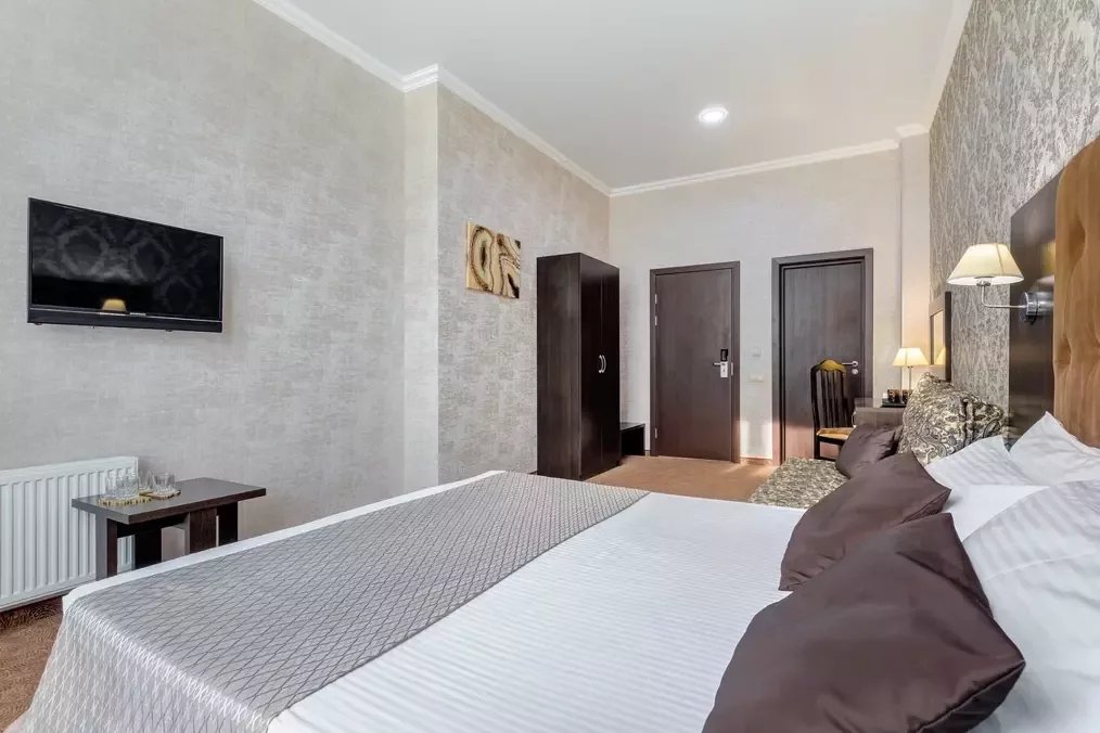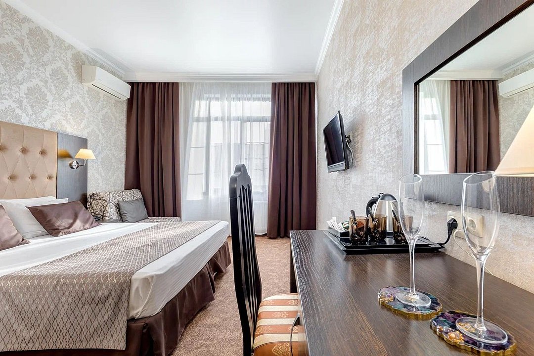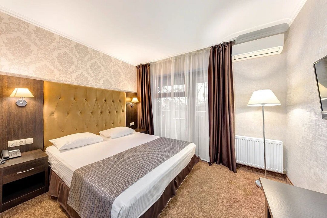Стандартный двухместный номер с двуспальной кроватью. В номере есть все необходимое для Вашего комфорта. Две прикроватные тумбочки, большой просторный шкаф, плазменный телевизор, мини-холодильник, чайная станция и просторная ванная комната с комплектом белых полотенец и брендовой косметики.