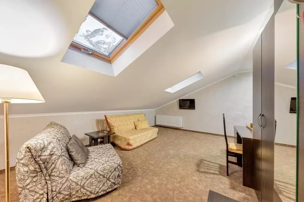 Номер идеально подходит для комфортного отдыха пары или родителей с детьми. Особенно удобно, если у вас маленький ребенок, так как в номере нет лестницы и он достаточно большой. В спальной комнате есть просторный балкон.