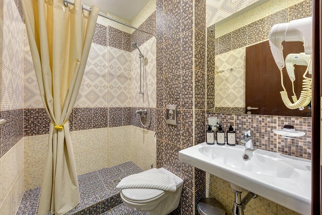 В номере есть большая ванная комната с душевой кабиной и санузлом, а также комплекты белых полотенец и брендированная косметика.