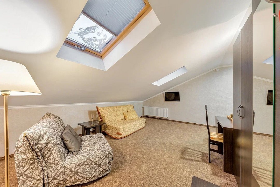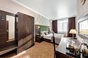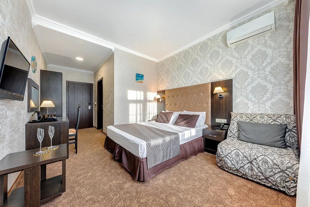 Двухместный номер с возможностью размещения ребенка. В номере есть двуспальная кровать (или две полуторные кровати) и кресло-кровать, который может служить дополнительным спальным местом.