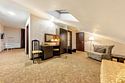 Номер категории «Люкс двухкомнатный с балконом» – это просторный номер, который может вместить до пяти человек. В нем есть два основных места: широкая двуспальная кровать в спальне и двухспальный диван в гостиной. Также можно установить дополнительное место для пятого гостя.