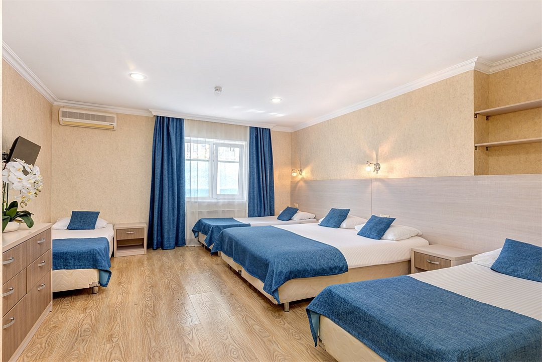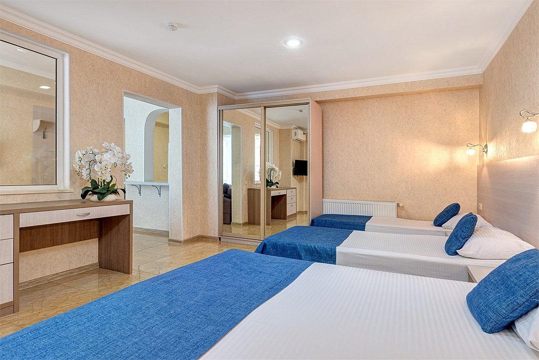 кабельное телевидение, Wi-Fi, светильник, фен, электронные замки, ванная комната, ванна, банные полотенца, пляжные полотенца, двуспальная кровать, односпальная кровать, тумбы, стулья, вешалки, журнальный столик, письменный стол, зеркало, обслуживание номеров, сейф, чайник, унитаз, раковина, отопление, кулер на этаже, три односпальные кровати, вид во двор, паркет, стаканы, туалетный столик, туалетные средства, сплит-система, сушилка для белья, телевизор с плоским экраном, мини-холодильник, шкаф-купе, номер для некурящихВ гостиничном номере