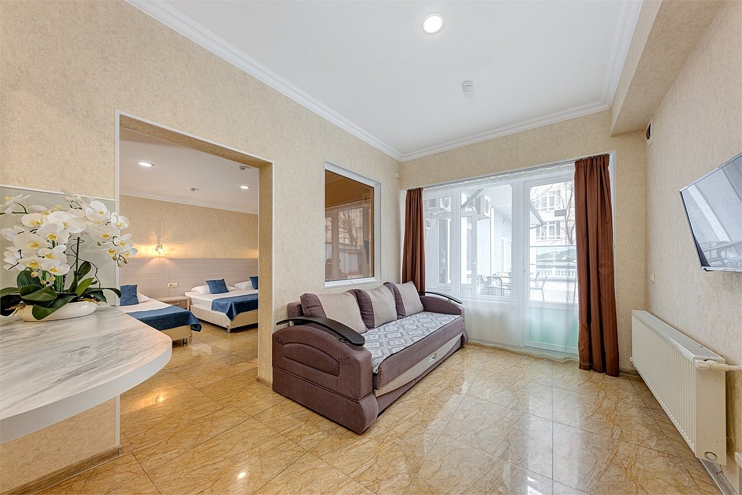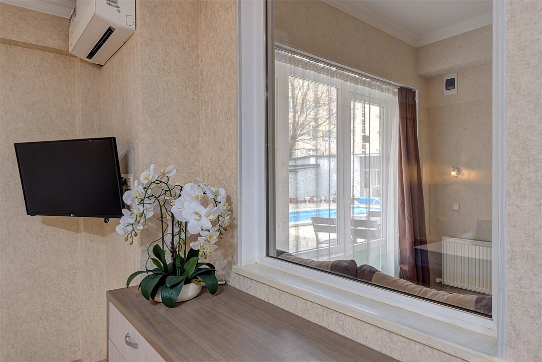 Абсолютно новые комфортабельные номера во втором корпусе отеля, с современным ремонтом. В номере есть все необходимое для комфортного проживания, имеется ванна. Отдельный двор с зоной подогреваемого бассейна. *Обратите внимание на то, что вид из окна и балкона отсутствует, вид на стену соседнего здания.Услуги и удобства