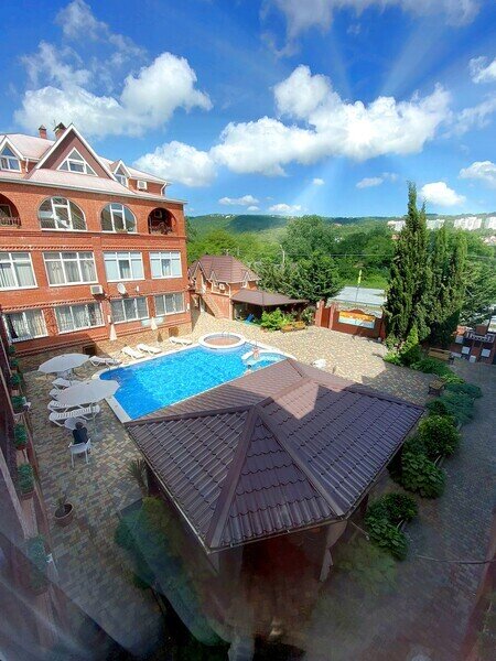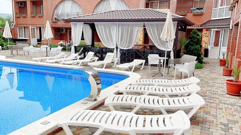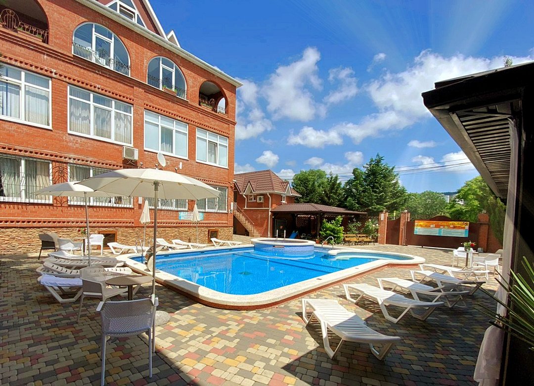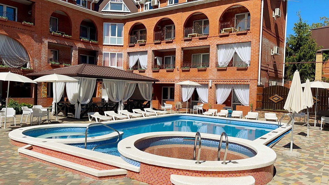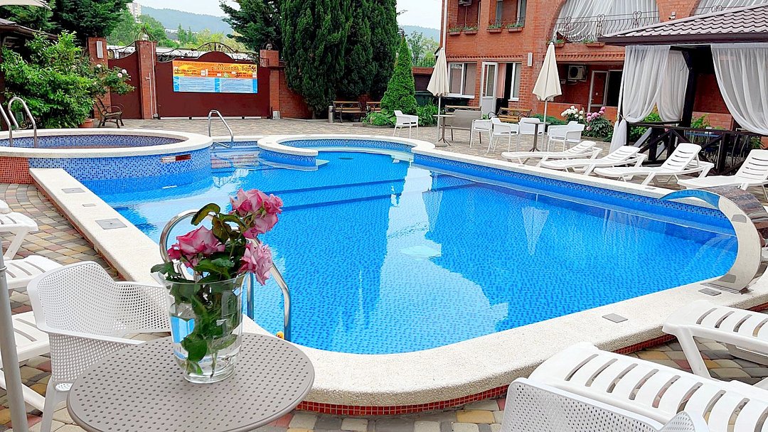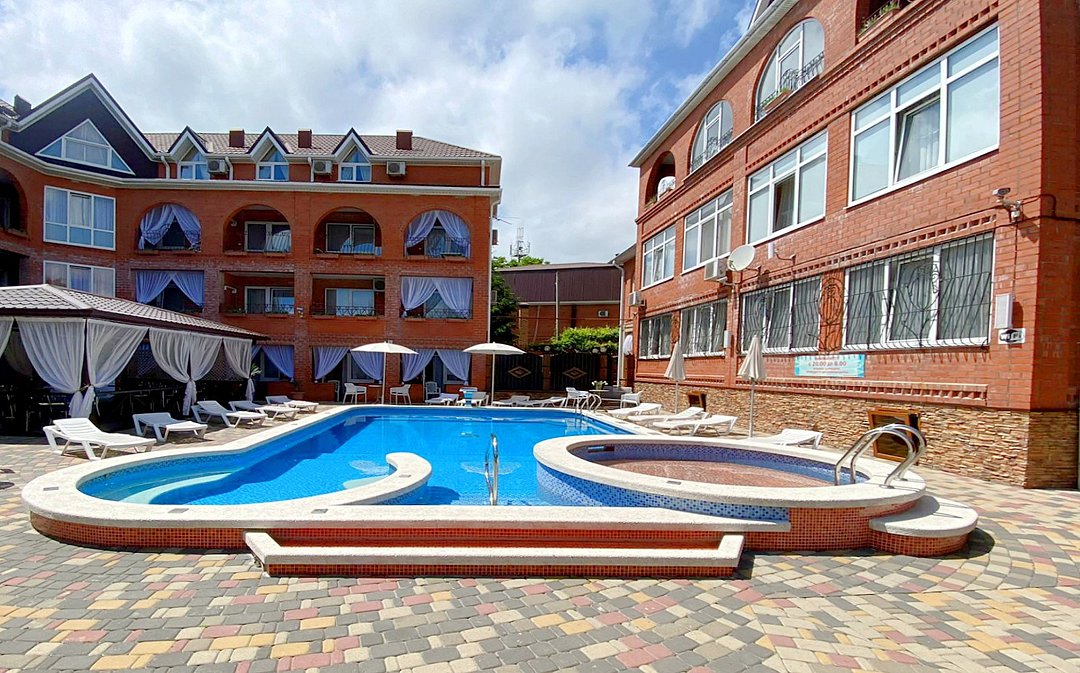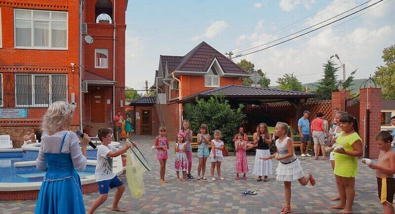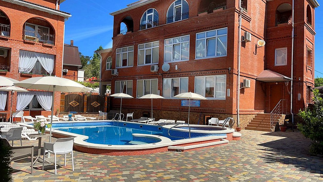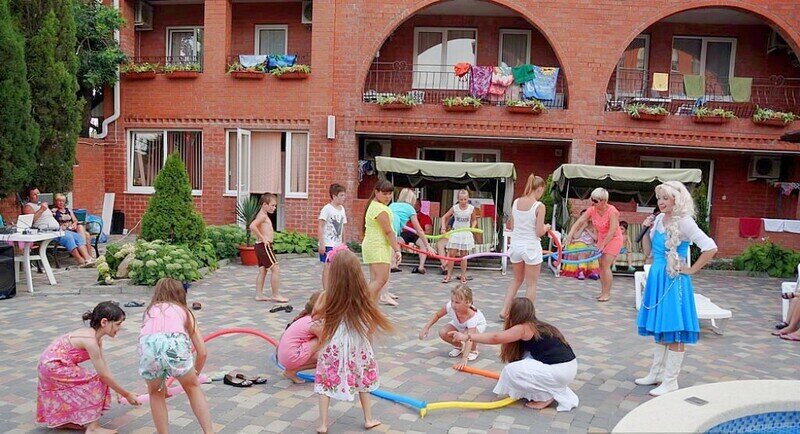Гостевой дом состоит из двух корпусов, и во дворе есть оборудованные бассейны для взрослых и детей, с удобными зонами отдыха с зонтиками и шезлонгами. Кроме того, для маленьких гостей проводятся анимационные программы и кинопоказы. Для размещения гостевого дома предлагаются уютные номера с необходимым оборудованием. В номерах есть телевизор, гардероб, спальные кровати, кондиционер и собственная ванная комната.
