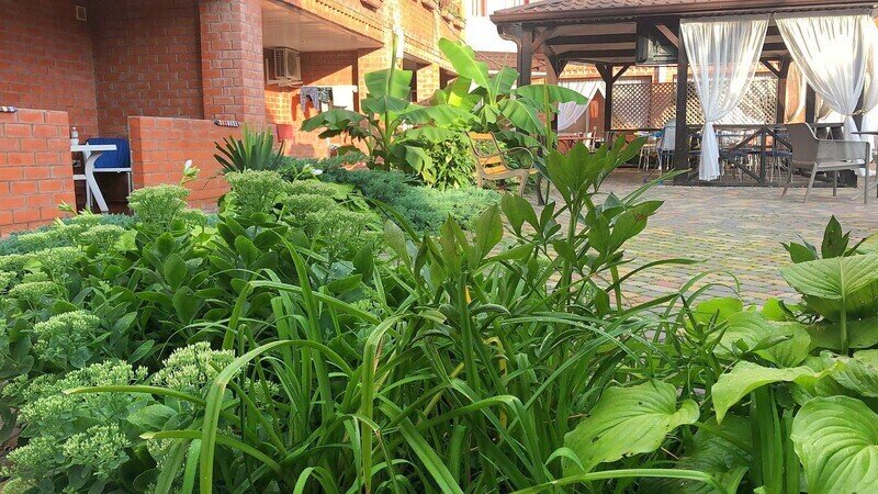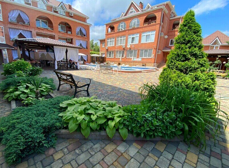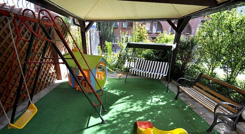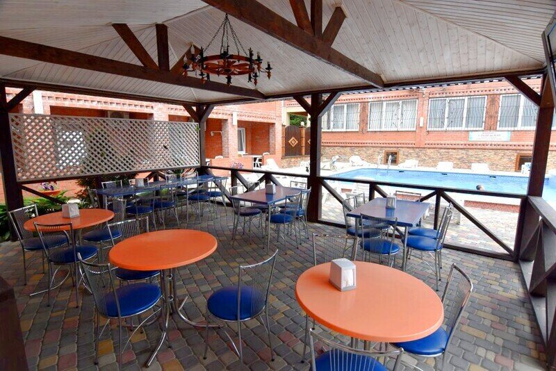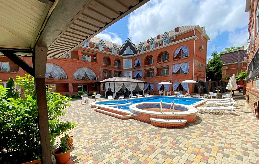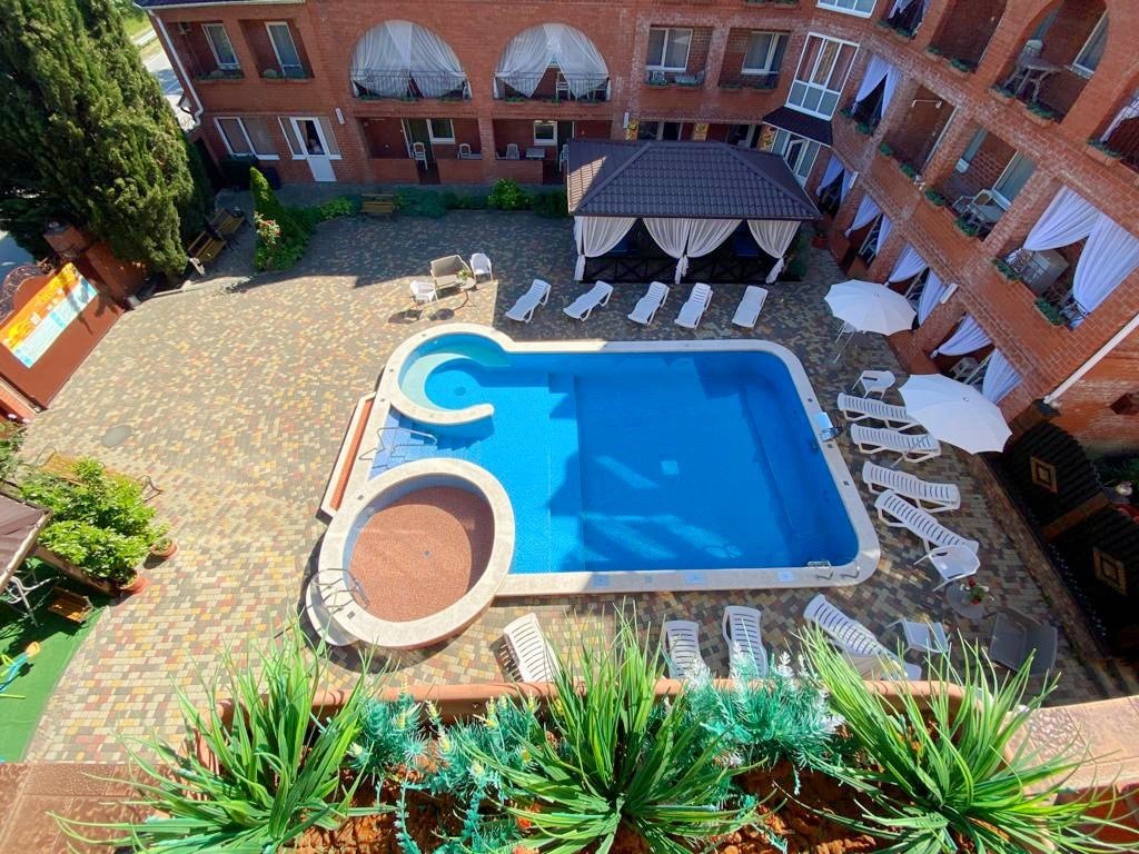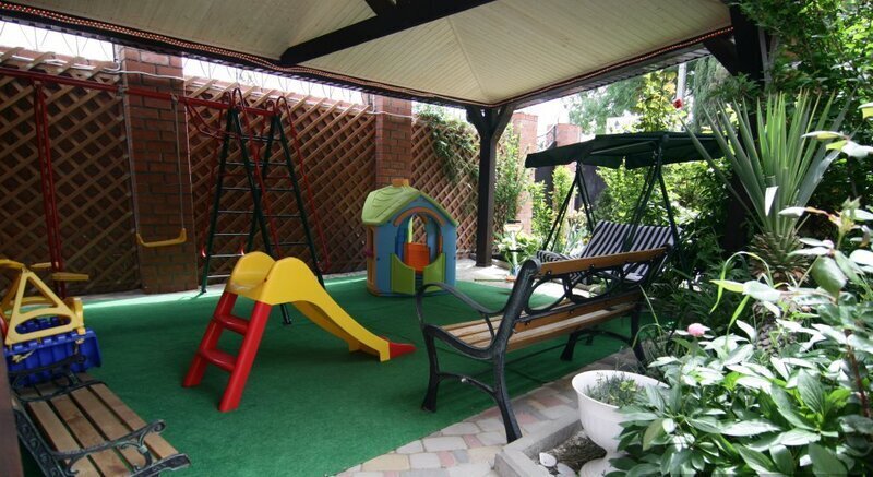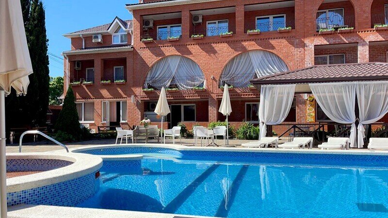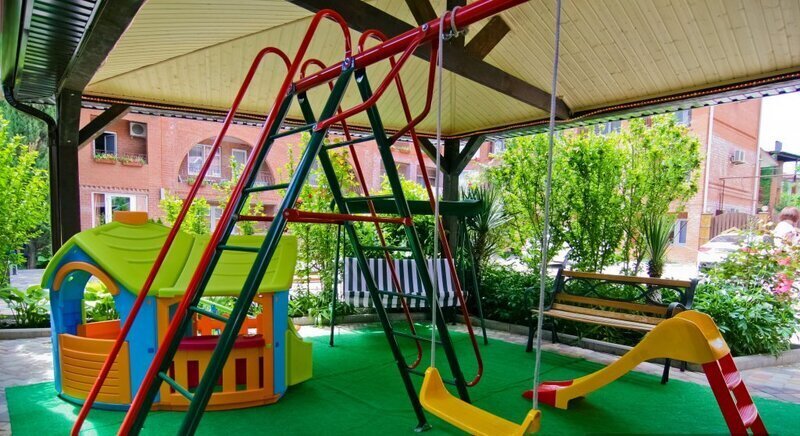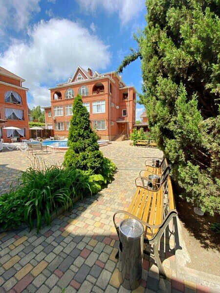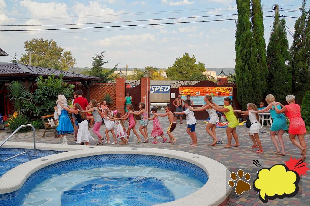 Гостевой дом состоит из двух корпусов, и во дворе есть оборудованные бассейны для взрослых и детей, с удобными зонами отдыха с зонтиками и шезлонгами. Кроме того, для маленьких гостей проводятся анимационные программы и кинопоказы. Для размещения гостевого дома предлагаются уютные номера с необходимым оборудованием. В номерах есть телевизор, гардероб, спальные кровати, кондиционер и собственная ванная комната.