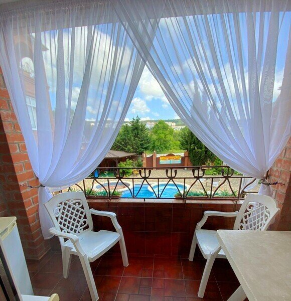 Уютный семейный номер, площадью 16м2, состоит из одной комнаты и санузла. Из номера выход на просторную террасу и к бассейну. Номер оснащен двуспальной кроватью с ортопедическим матрасом и раскладным диваном (140*200), тумбочками, шкафом для одежды, туалетным столиком с пуфиком, зеркалом, холодильником, кондиционером, телевизором с плоским экраном, чайником. Санузел совмещенный с душевой кабиной. Номер укомплектован постельным бельем, полотенцами, тапочками, мыльными принадлежностями.Услуги и удобства