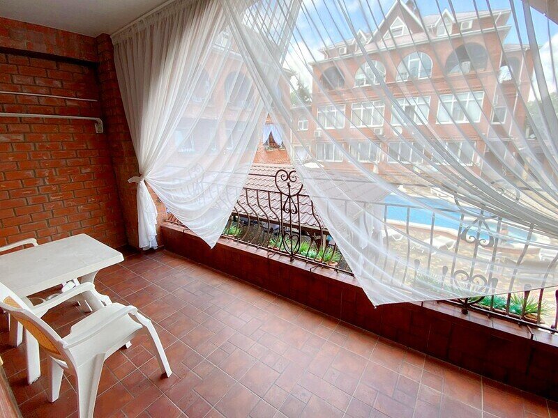 Wi-Fi, холодильник, кондиционер, фен, санузел, банные полотенца, тапочки, терраса, двуспальная кровать, ортопедический матрас, тумбы, шкаф для одежды, вешалки, зеркало, обслуживание номеров, чайник, унитаз, раковина, отдельный вход в номер, душ, плиточное покрытие, стаканы, туалетный столик, туалетный столик, туалетные средства, цифровое тв, телевизор с плоским экраном, номер для некурящих, вид на бассейн, пуфик, общественный бассейн, можно с питомцамиВ номере