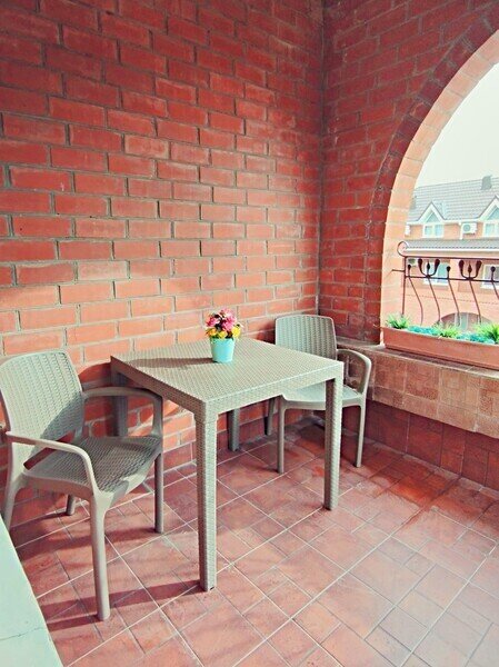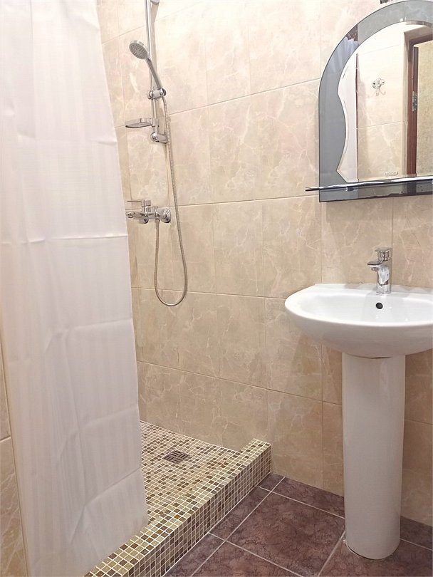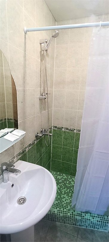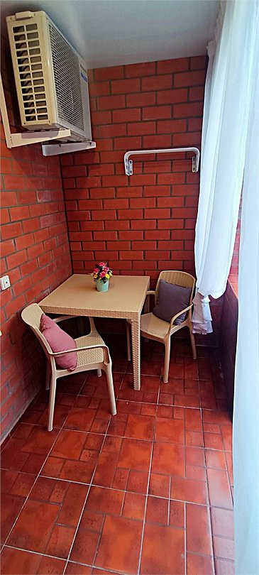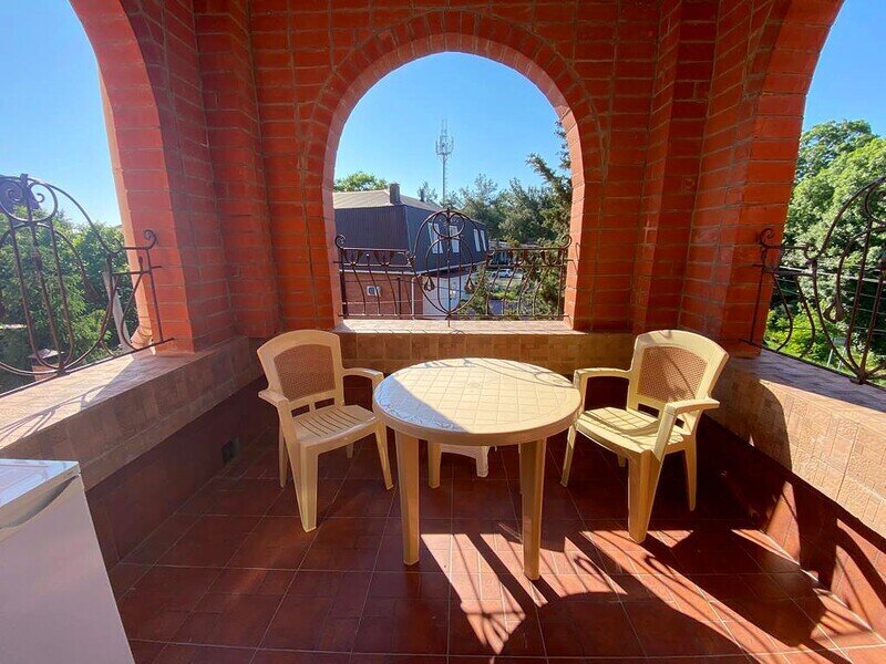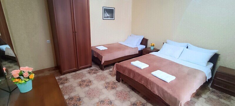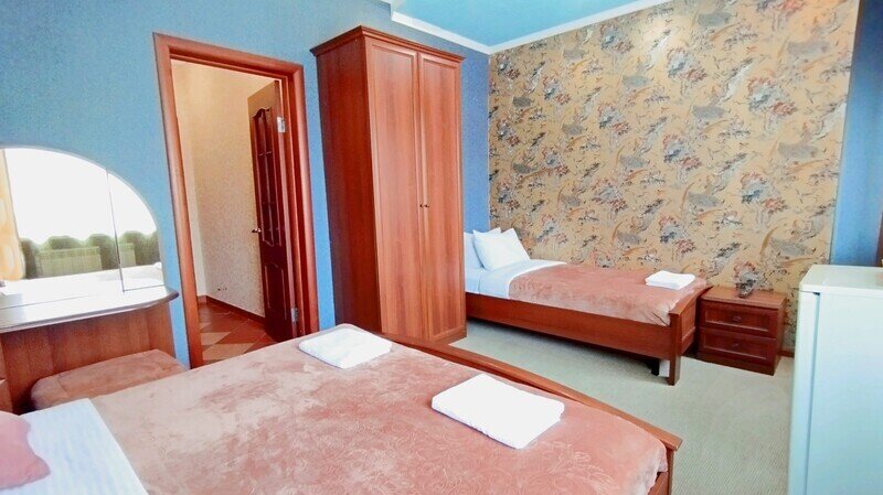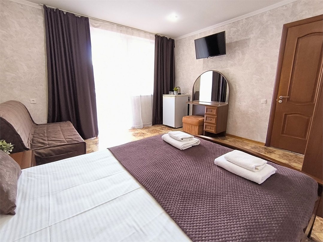 Просторный трехместный номер состоит из двух комнат, санузла и большой лоджии. Номер оснащен двуспальной кроватью с ортопедическим матрасом, раскладным диваном, тумбочками, шкафом для одежды, туалетным столиком с пуфиком, журнальным столиком, зеркалом, холодильником, кондиционером, телевизором с плоским экраном, чайником. Санузел совмещенный с душевой кабиной. Номер укомплектован постельным бельем, полотенцами, тапочками, мыльными принадлежностями.Услуги и удобства