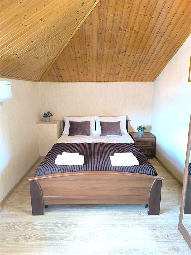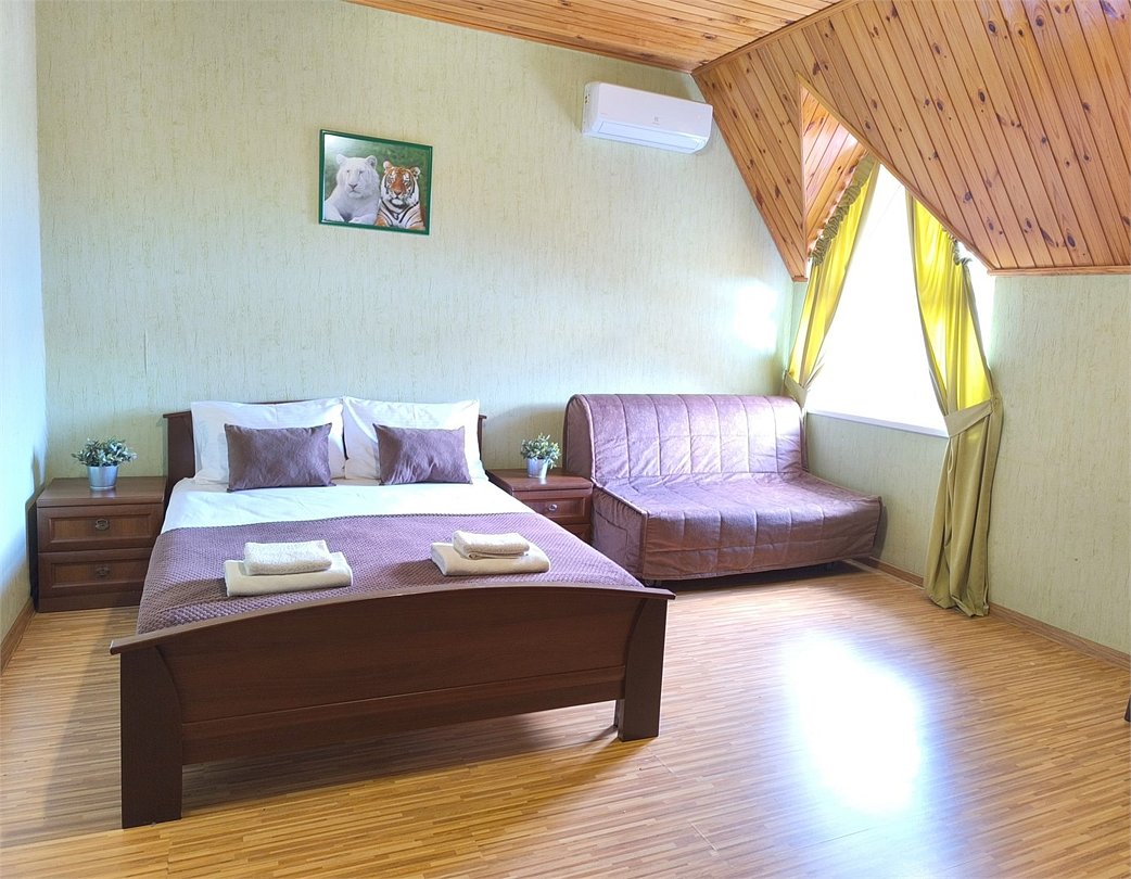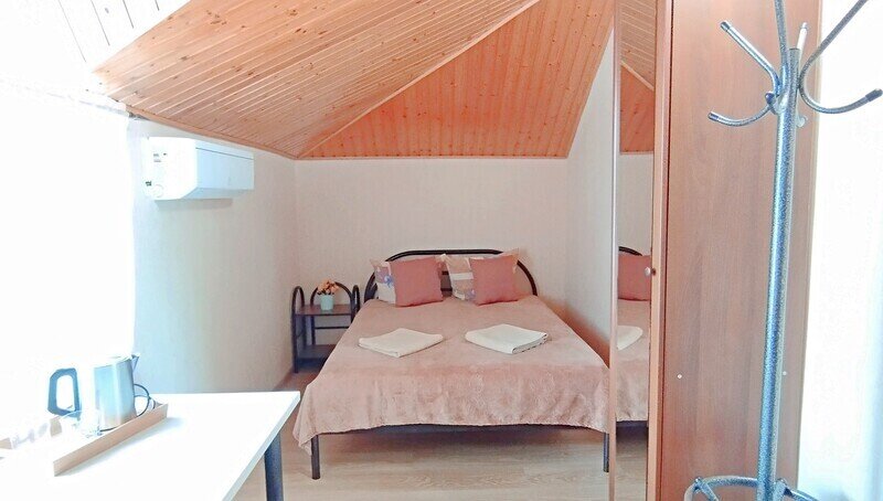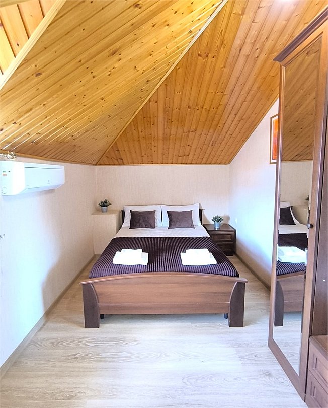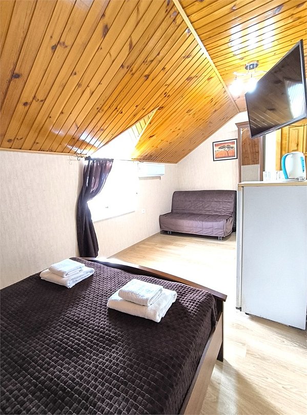 кабельное телевидение, Wi-Fi, кондиционер, банные полотенца, тапочки, двуспальная кровать, тумбы, шкаф для одежды, вешалки, зеркало, чайник, унитаз, раковина, душ, туалетный столик, туалетные средства, диван-кровать, раскладной диван, телевизор с плоским экраном, мини-холодильник, мансардные окна, номер для некурящих, пуфик, общественный бассейн, уборка номера, бутилированная вода, мыло, можно с питомцамиВ номере