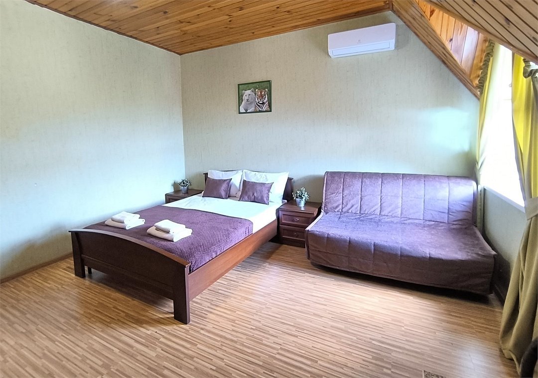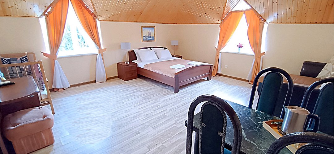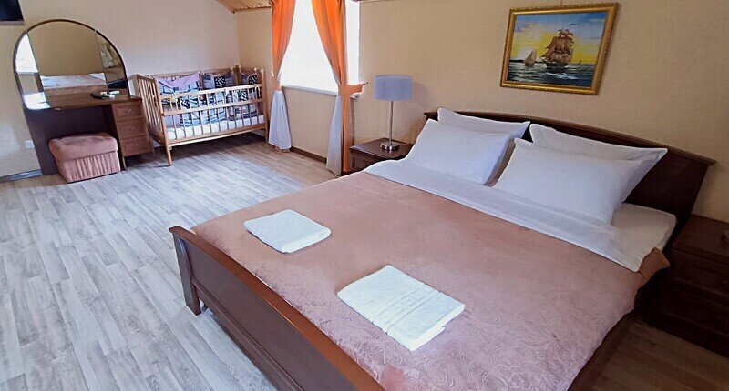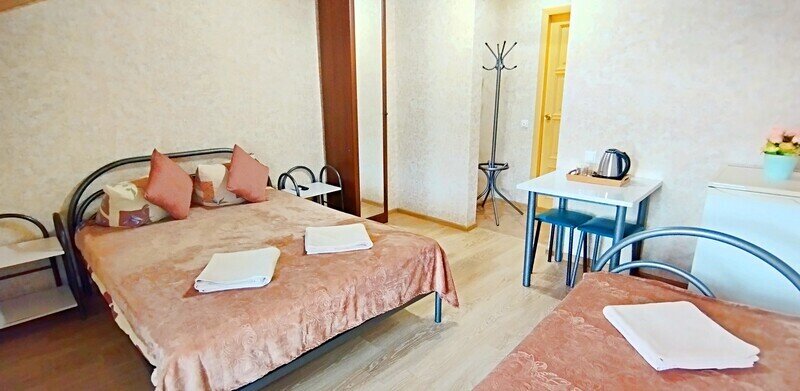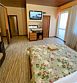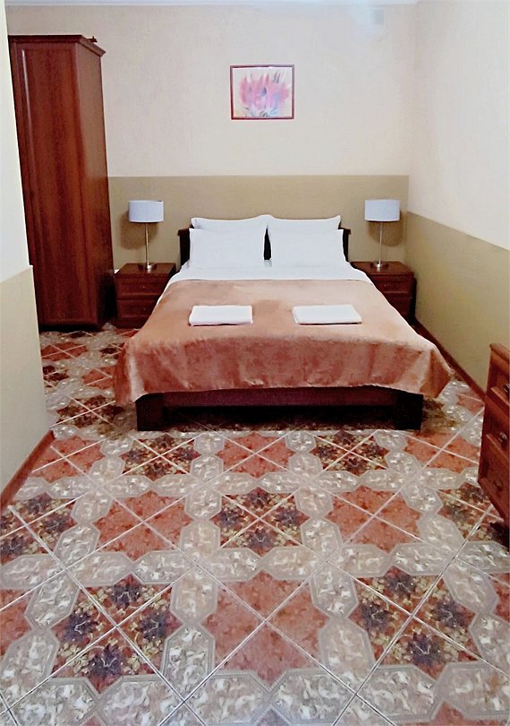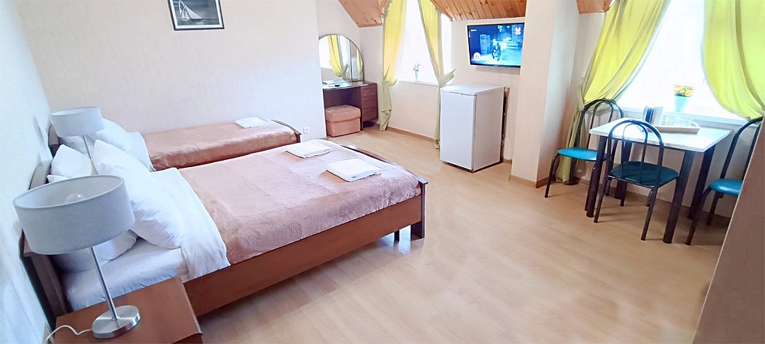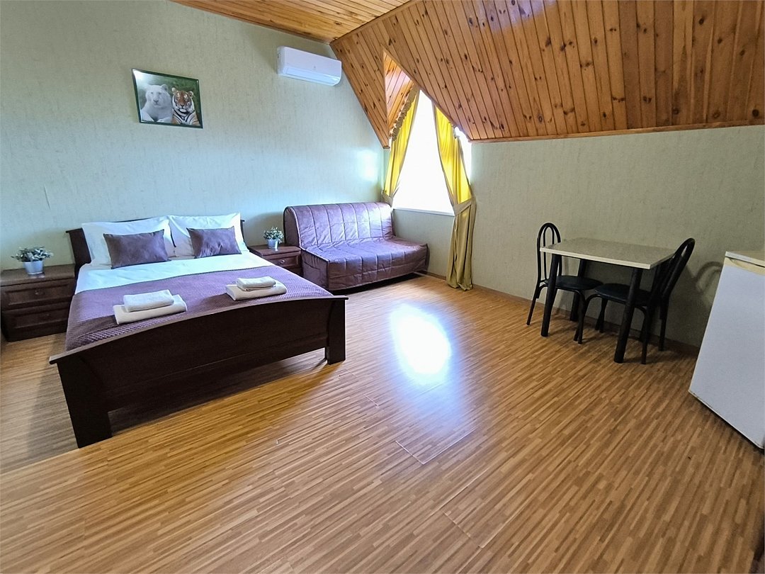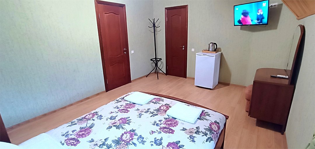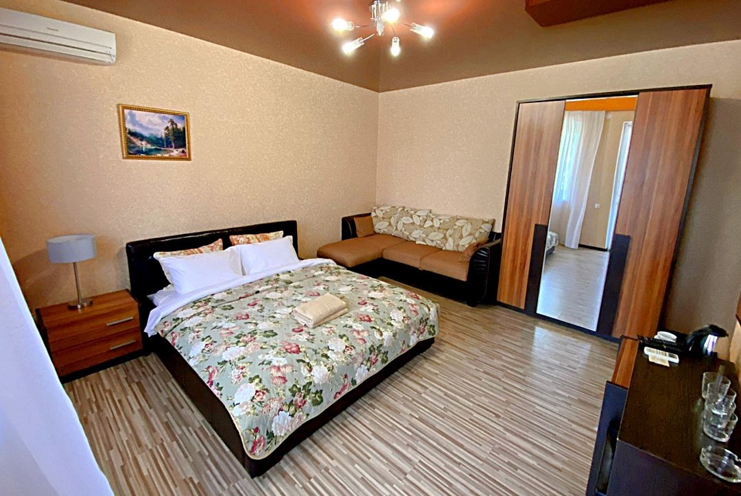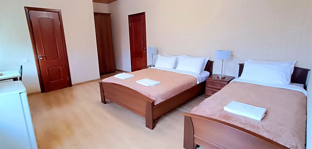 Просторный семейный номер вмещает до 5 гостей. Состоит из коридора, комнаты и санузла. Номер оснащен двуспальной кроватью с ортопедическим матрасом и двуспальным диваном, тумбочками, шкафом для одежды, туалетным столиком с зеркалом, холодильником, кондиционером, телевизором с плоским экраном, чайником. Санузел совмещенный с душевой кабиной. Номер укомплектован постельным бельем, полотенцами, тапочками, мыльными принадлежностями.Услуги и удобства