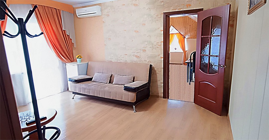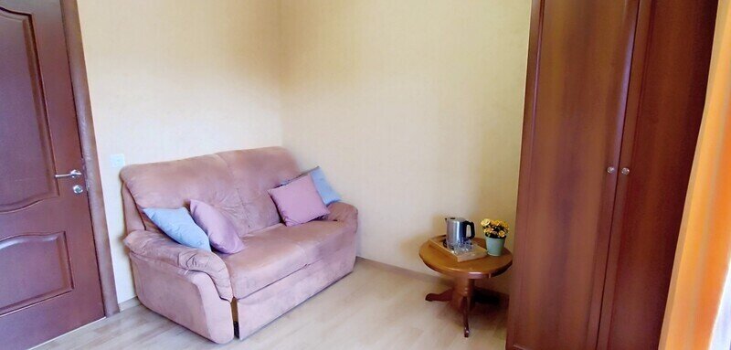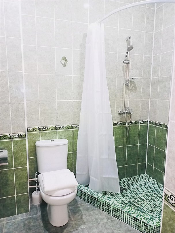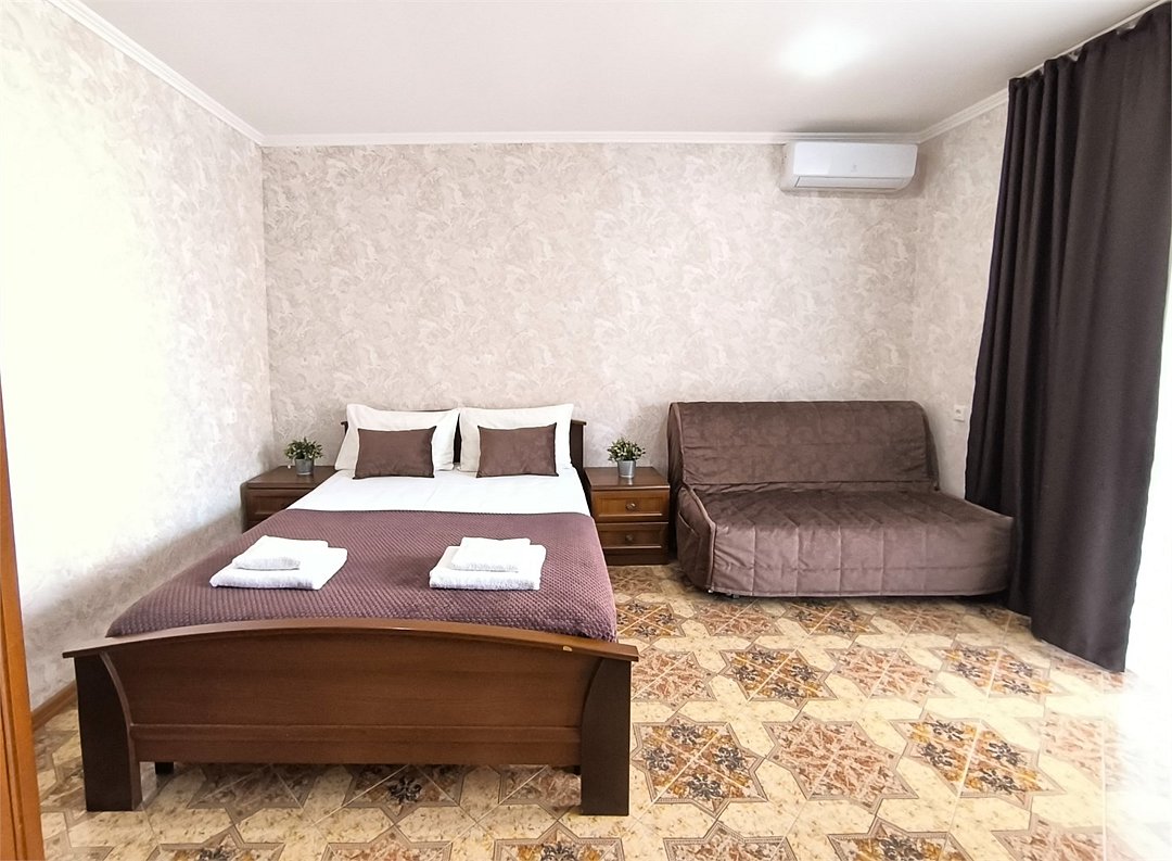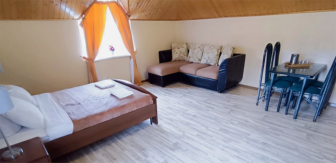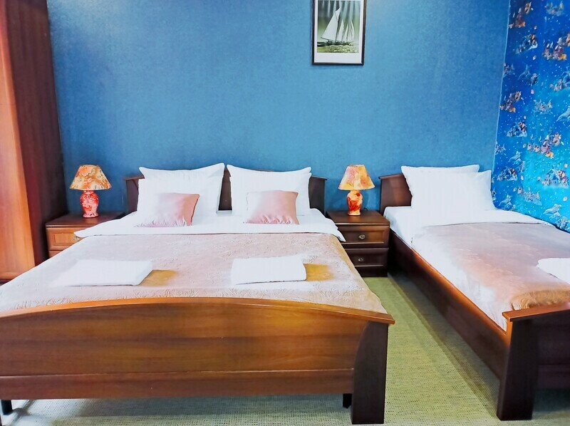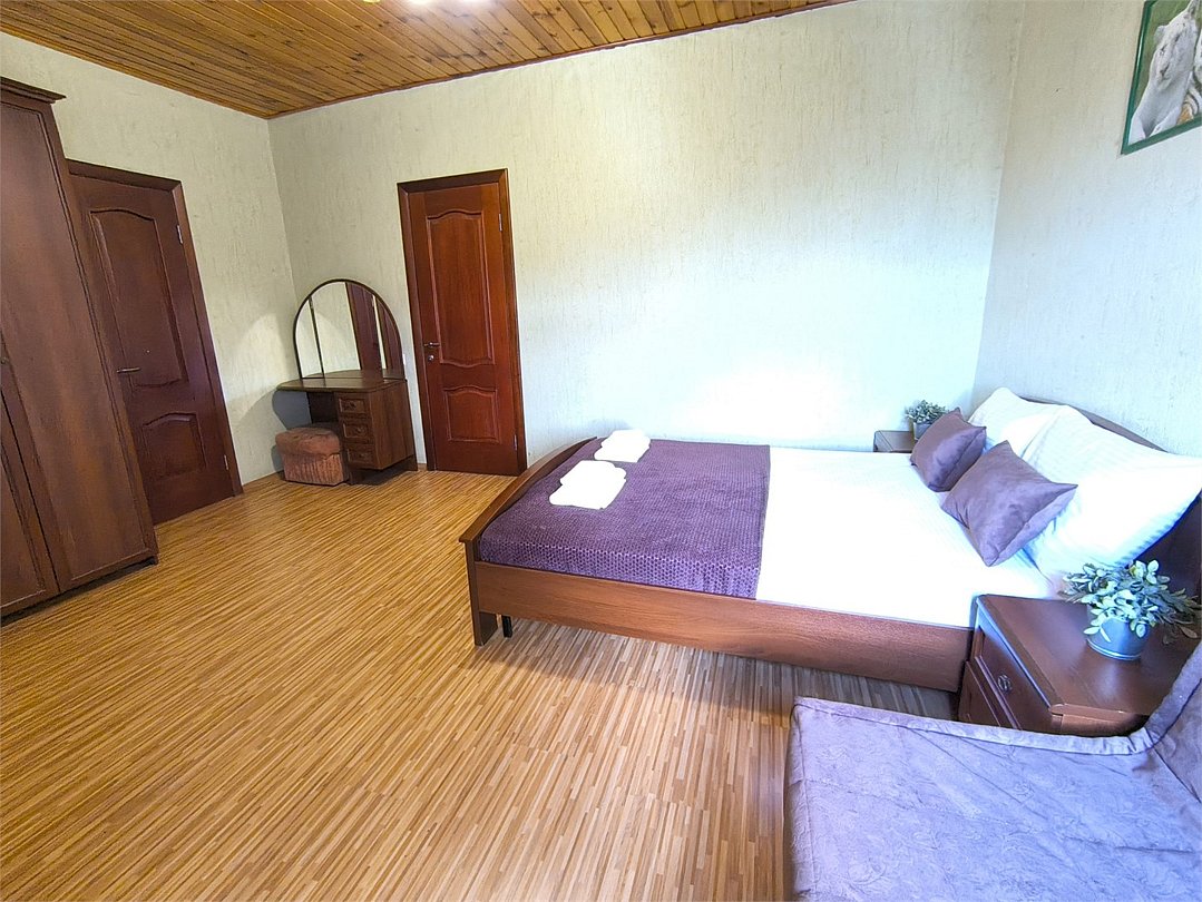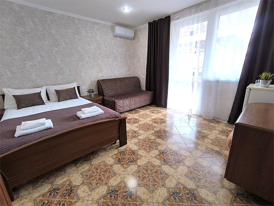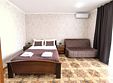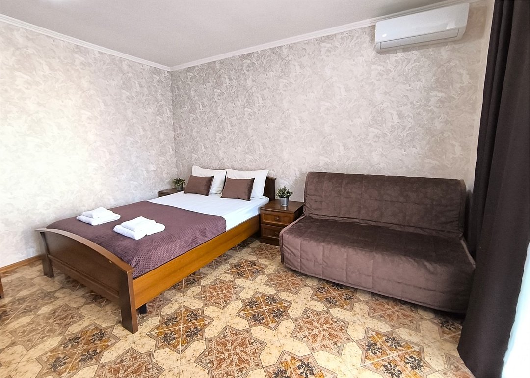 Просторный семейный номер вмещает до 5 гостей. Состоит из коридора, комнаты и санузла. Номер оснащен двуспальной кроватью с ортопедическим матрасом и двуспальным диваном, тумбочками, шкафом для одежды, туалетным столиком с зеркалом, холодильником, кондиционером, телевизором с плоским экраном, чайником. Санузел совмещенный с душевой кабиной. Номер укомплектован постельным бельем, полотенцами, тапочками, мыльными принадлежностями.Услуги и удобства