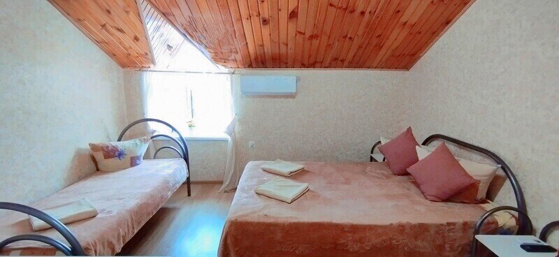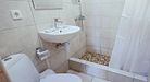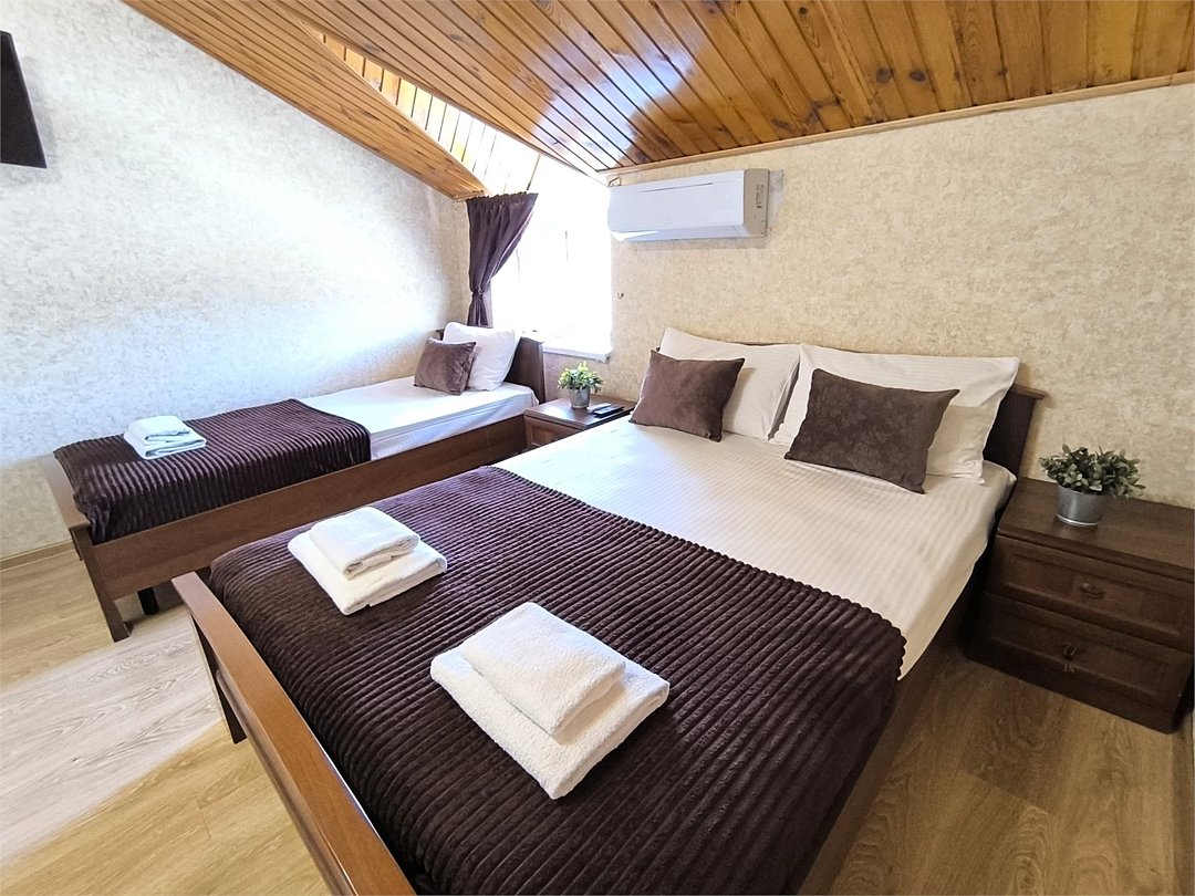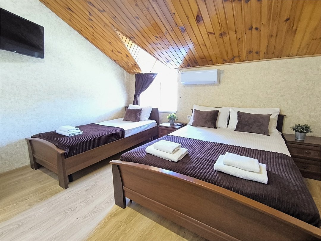 Уютный трехместный номер, площадью 15м2, состоит из одной комнаты и санузла. Номера данной категории расположены на 4-ом мансардном этаже. На верхние этажи подняться можно только по лестнице. Номер оснащен двуспальной и односпальной кроватями с ортопедическими матрасами, тумбочками, шкафом для одежды, туалетным столиком с зеркалом, мини-холодильником, кондиционером, телевизором с плоским экраном, чайником. Санузел совмещенный с душевой кабиной. Номер укомплектован постельным бельем, полотенцами, тапочками, мыльными принадлежностями.Услуги и удобства
