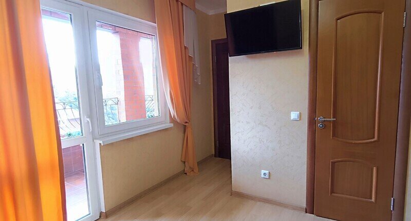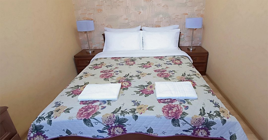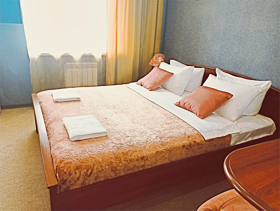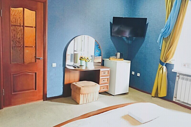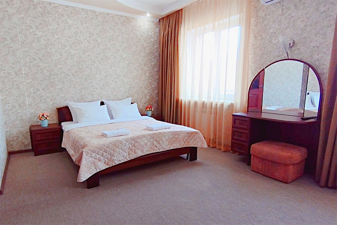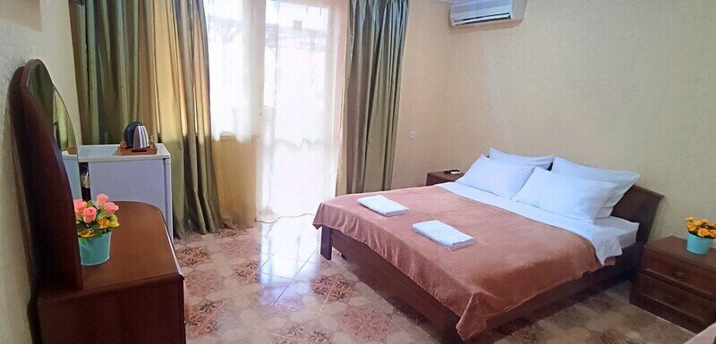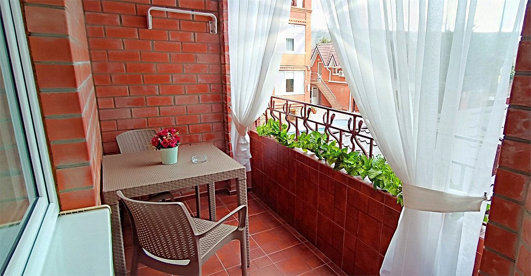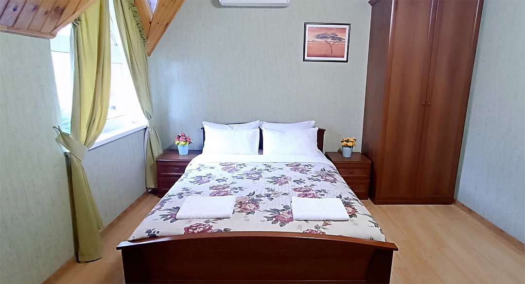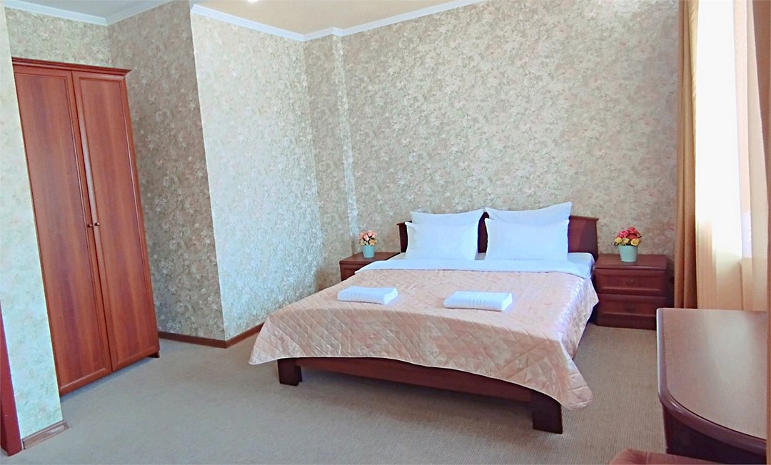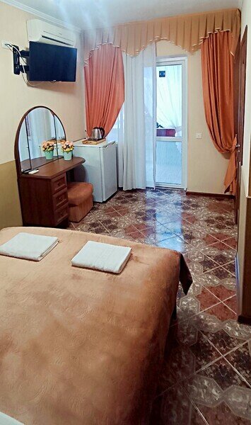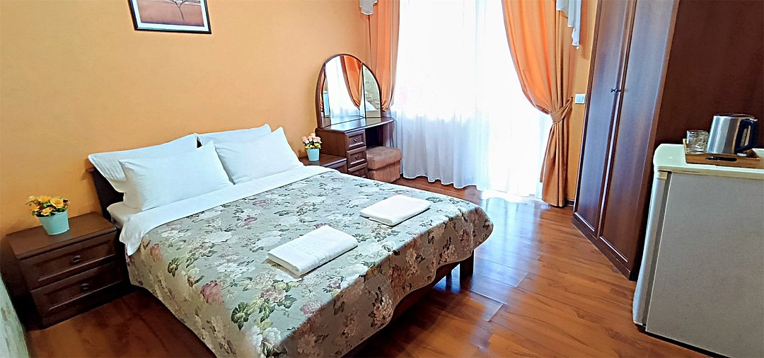 Уютный двухместный номер состоит из одной комнаты и санузла. Из номера выход на просторный балкон. Номер оснащен двуспальной кроватью с ортопедическим матрасом, тумбочками, шкафом для одежды, туалетным столиком с пуфиком, зеркалом, холодильником, кондиционером, телевизором с плоским экраном, чайником. Санузел совмещенный с душевой кабиной. Номер укомплектован постельным бельем, полотенцами, тапочками, мыльными принадлежностями.Услуги и удобства