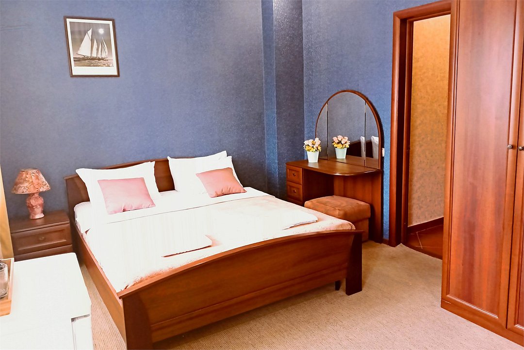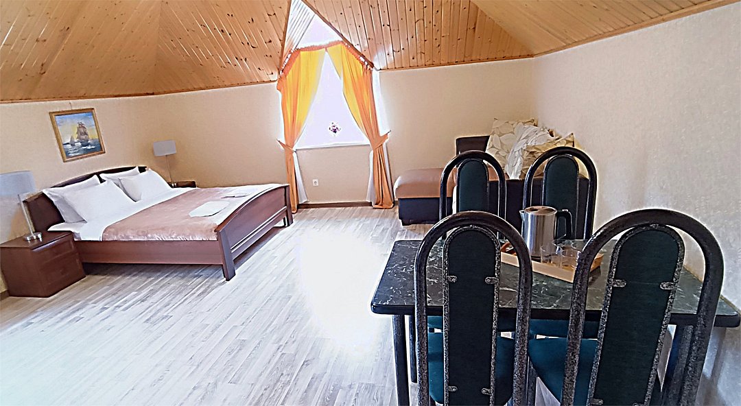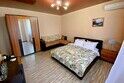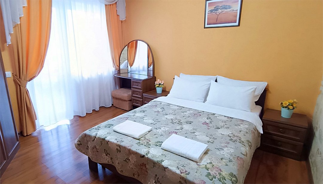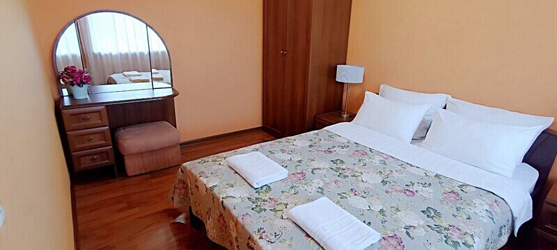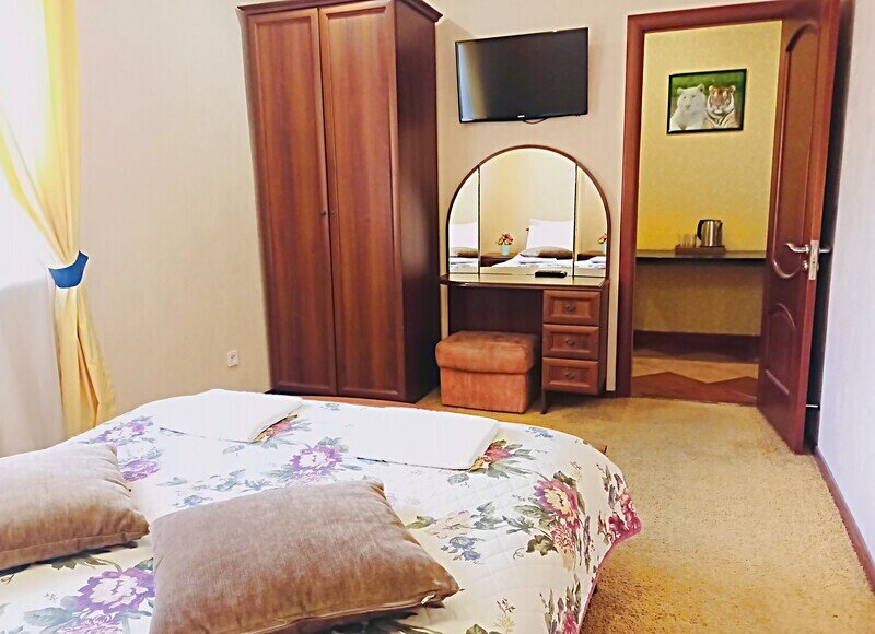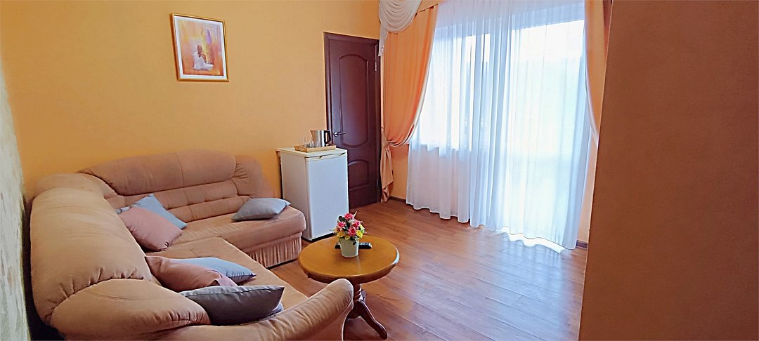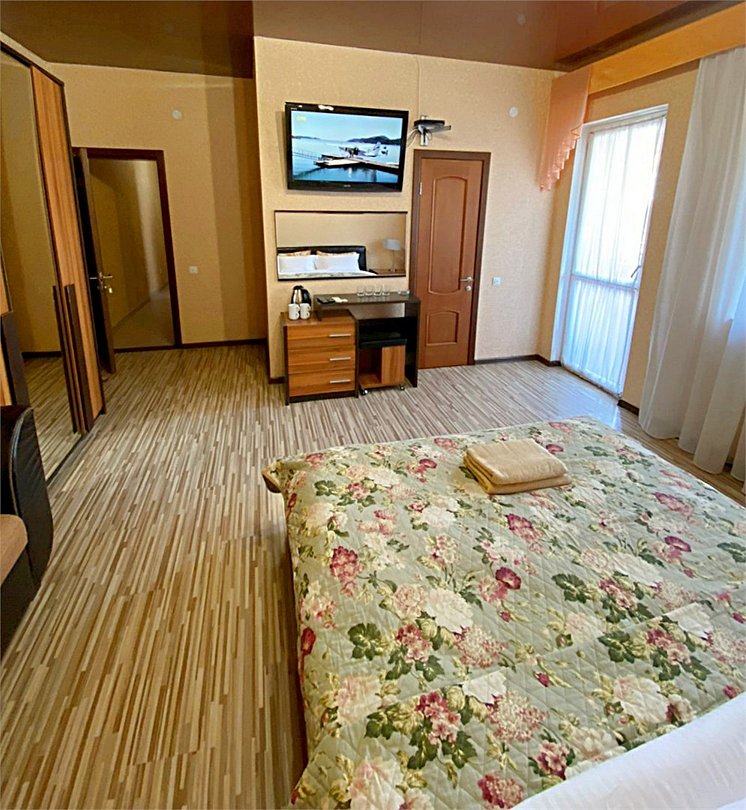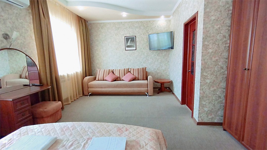 Просторный четырехместный номер состоит из двух комнат, санузла и большой лоджии. Номер оснащен двуспальной кроватью с ортопедическим матрасом, двуспальным диваном, тумбочками, шкафом для одежды, туалетным столиком с пуфиком, журнальным столиком, зеркалом, холодильником, кондиционером, телевизором с плоским экраном, чайником. Санузел совмещенный с душевой кабиной. Номер укомплектован постельным бельем, полотенцами, тапочками, мыльными принадлежностями.Услуги и удобства