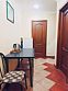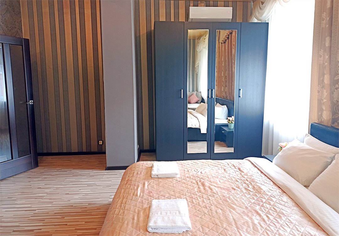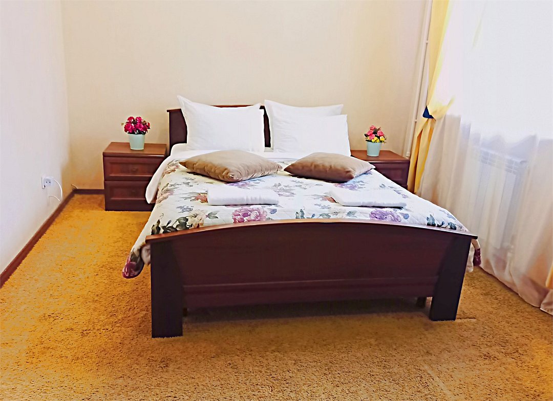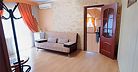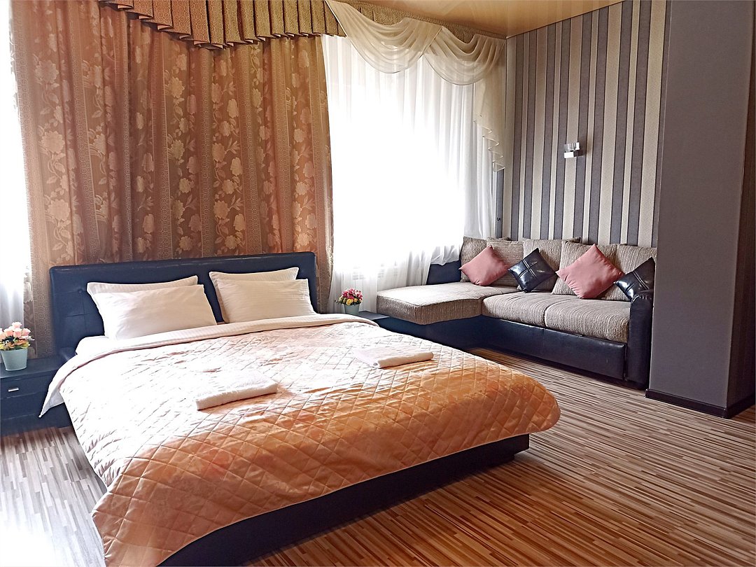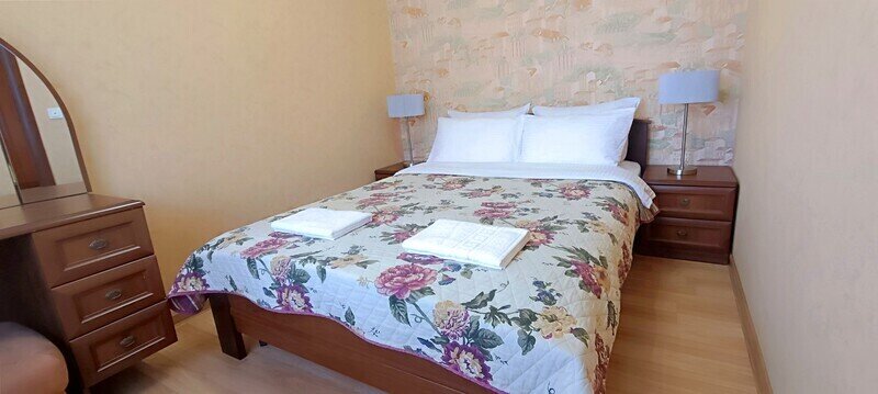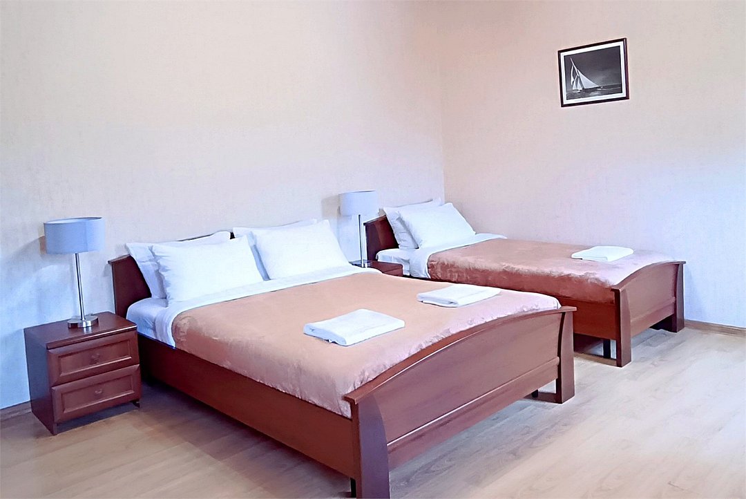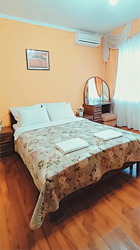 Просторный четырехместный номер состоит из двух комнат, санузла и большой лоджии. Номер оснащен двуспальной кроватью с ортопедическим матрасом, двуспальным диваном, тумбочками, шкафом для одежды, туалетным столиком с пуфиком, журнальным столиком, зеркалом, холодильником, кондиционером, телевизором с плоским экраном, чайником. Санузел совмещенный с душевой кабиной. Номер укомплектован постельным бельем, полотенцами, тапочками, мыльными принадлежностями.Услуги и удобства