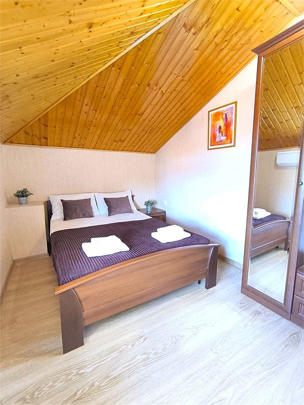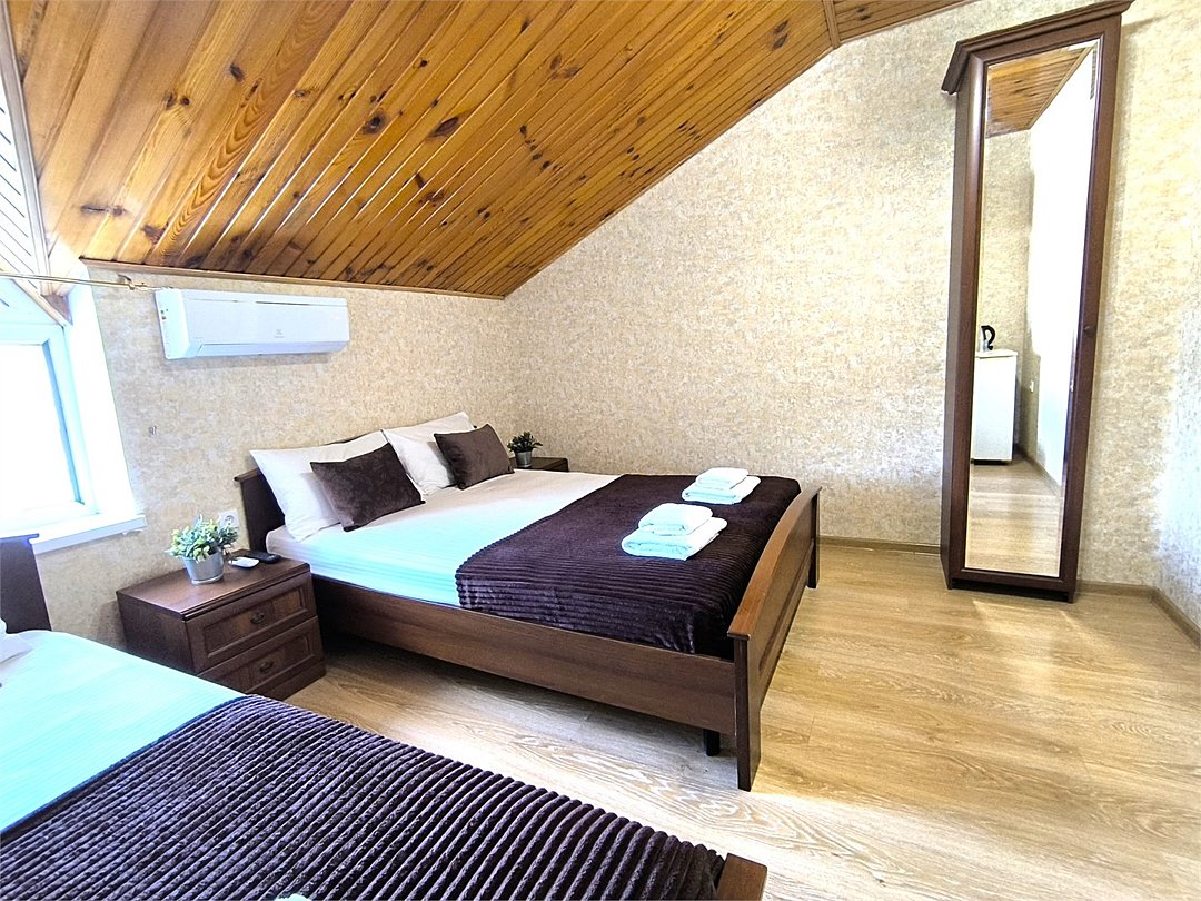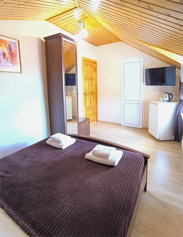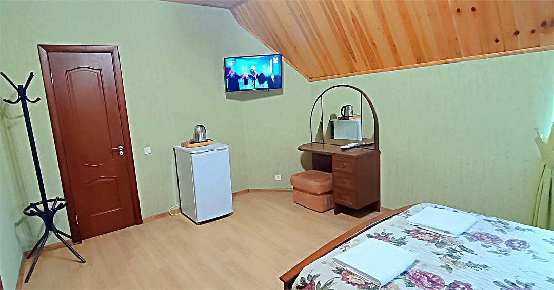 Wi-Fi, холодильник, кондиционер, фен, санузел, банные полотенца, тапочки, двуспальная кровать, ортопедический матрас, тумбы, шкаф для одежды, вешалки, зеркало, обслуживание номеров, чайник, унитаз, раковина, душ, вид на город, ламинат, стаканы, туалетный столик, туалетный столик, туалетные средства, цифровое тв, телевизор с плоским экраном, вид на горы, мансардные окна, номер для некурящих, пуфик, общественный бассейн, можно с питомцамиВ номере