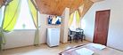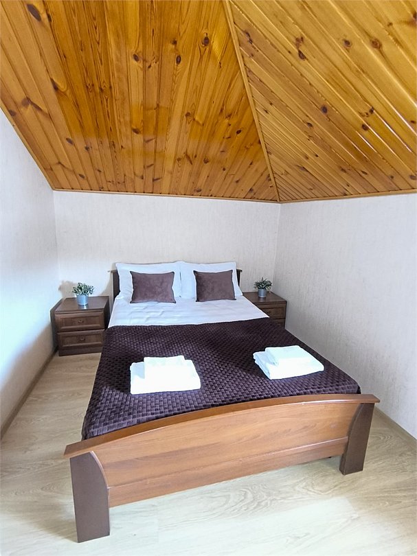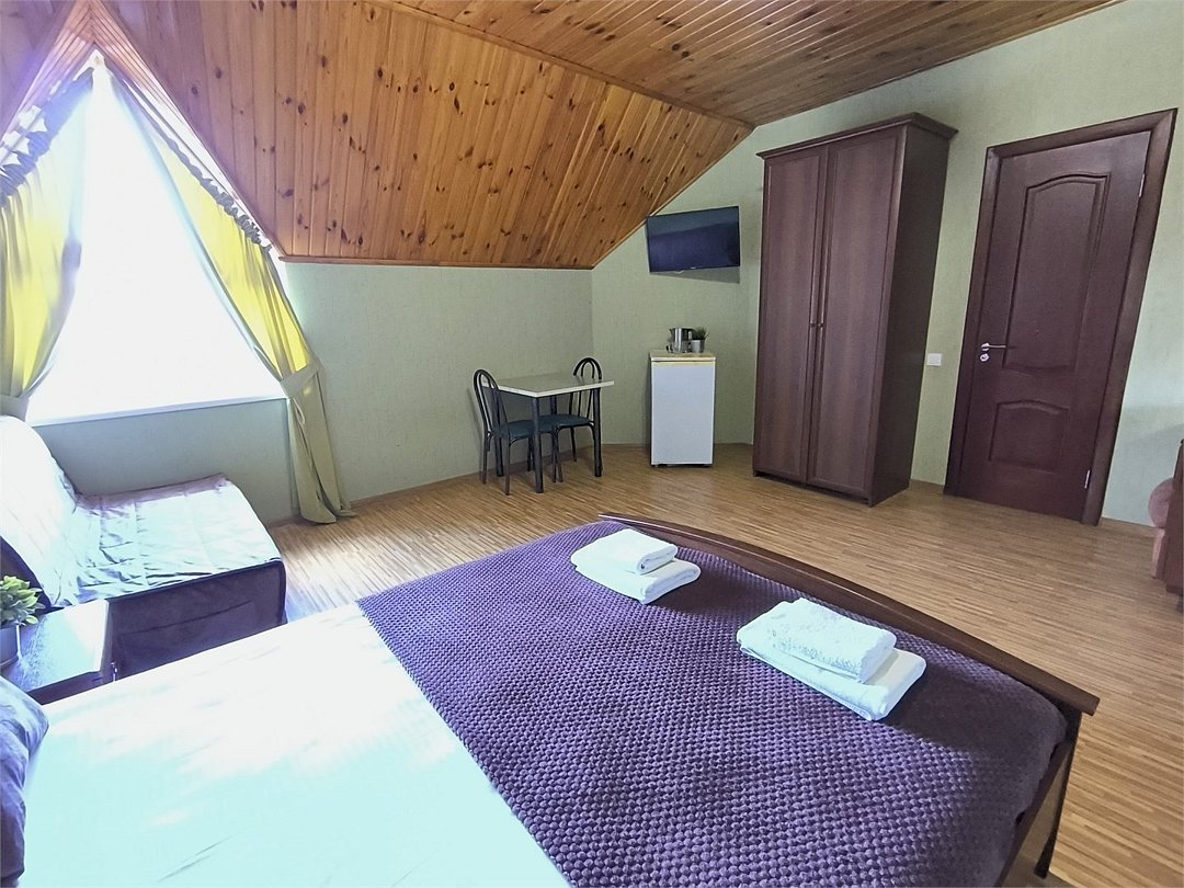 кабельное телевидение, Wi-Fi, кондиционер, светильник, банные полотенца, тапочки, двуспальная кровать, ортопедический матрас, тумбы, шкаф для одежды, вешалки, зеркало, чайник, унитаз, раковина, душ, стаканы, туалетные средства, диван-кровать, раскладной диван, телевизор с плоским экраном, мини-холодильник, мансардные окна, номер для некурящих, общественный бассейн, уборка номера, бутилированная вода, мыло, можно с питомцамиВ номере