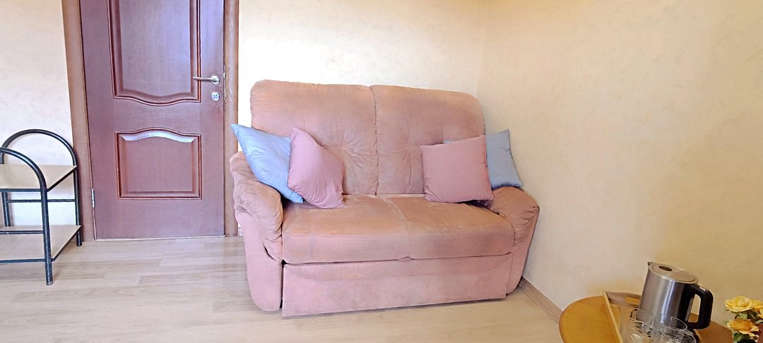 Уютный семейный номер, площадью 16м2, состоит из коридора, комнаты и санузла. Номера данной категории расположены на 3 этаже. На верхние этажи подняться можно только по лестнице. Номер оснащен двуспальной и раскладным диваном (140*200), тумбочками, шкафом для одежды, туалетным столиком с зеркалом, мини-холодильником, кондиционером, телевизором с плоским экраном, чайником. Санузел совмещенный с душевой кабиной. Номер укомплектован постельным бельем, полотенцами, тапочками, мыльными принадлежностями.Услуги и удобства