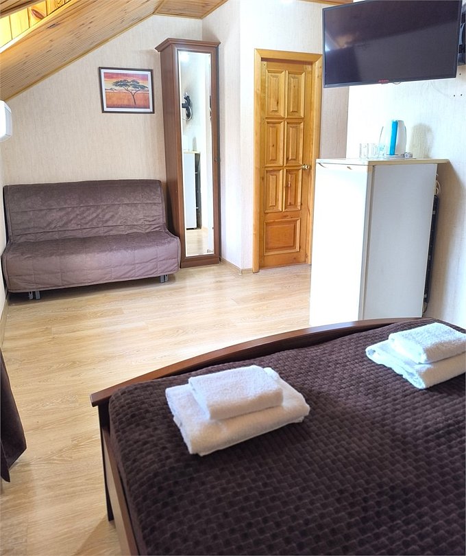 Небольшой семейный номер, площадью 14 м2, состоит из одной комнаты и санузла. Номера данной категории расположены на 4-ом мансардном этаже. На верхние этажи подняться можно только по лестнице. Номер оснащен двуспальной кроватью и раскладным диваном (140*200), тумбочками, шкафом для одежды, зеркалом, мини-холодильником, кондиционером, телевизором с плоским экраном, чайником. Санузел совмещенный с душевой кабиной. Номер укомплектован постельным бельем, полотенцами, тапочками, мыльными принадлежностями.Услуги и удобства
