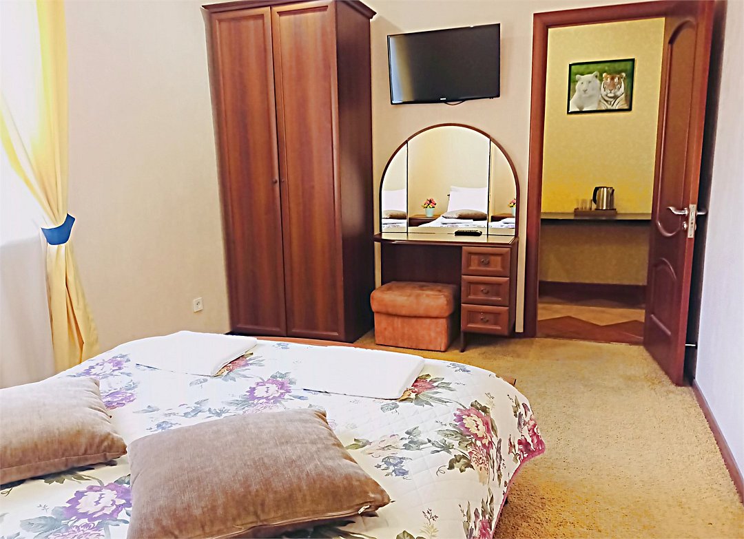 Просторный четырехместный номер состоит из двух комнат, санузла и коридора. Номер оснащен двуспальной кроватью с ортопедическим матрасом, двумя односпальными кроватями, тумбочками, шкафом для одежды, туалетным столиком с пуфиком, журнальным столиком, зеркалом, обеденной зоной, холодильником, кондиционером, телевизором с плоским экраном, чайником. Санузел совмещенный с душевой кабиной. Номер укомплектован постельным бельем, полотенцами, тапочками, мыльными принадлежностями.Услуги и удобства