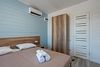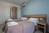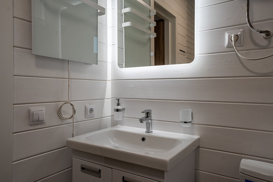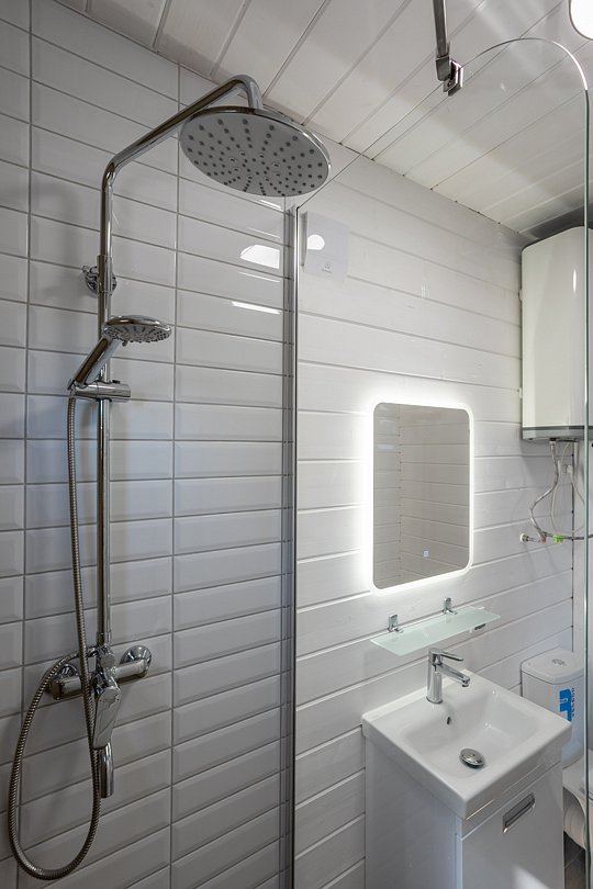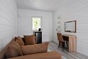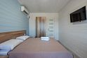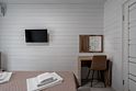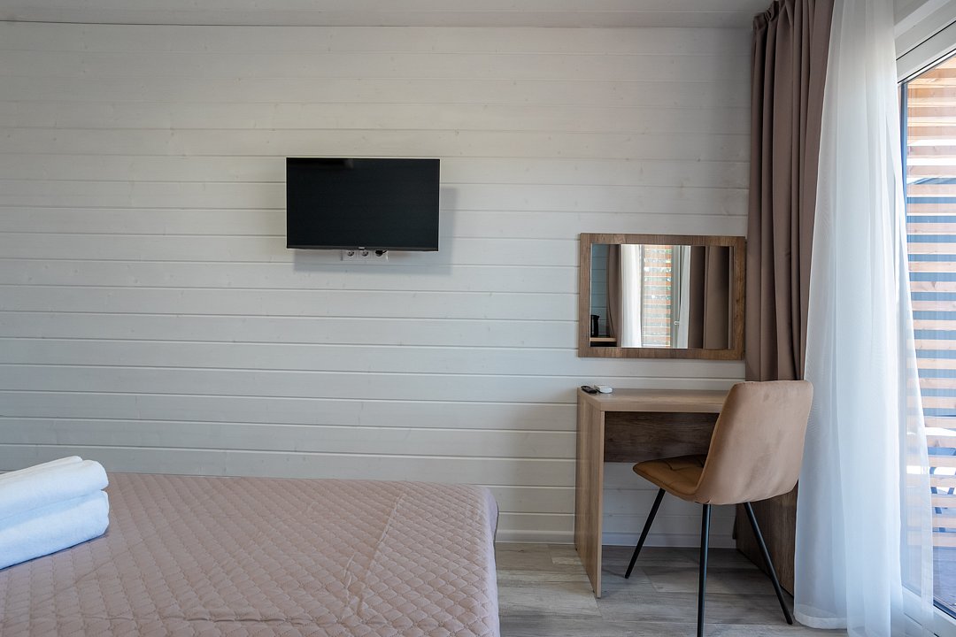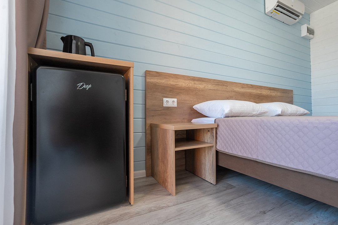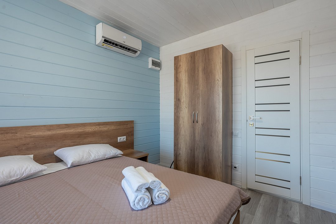 Двухкомнатный четырехместный домик, ТВ с плоским экраном, шкаф, две тумбочки, зеркало, журнальный столик, чайник, холодильник, кондиционер. Санузел: душ, раковина, унитаз, полотенца, туалетные принадлежности. На веранде столик со стульями.