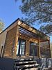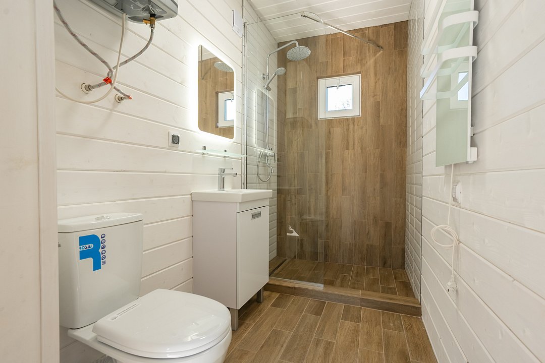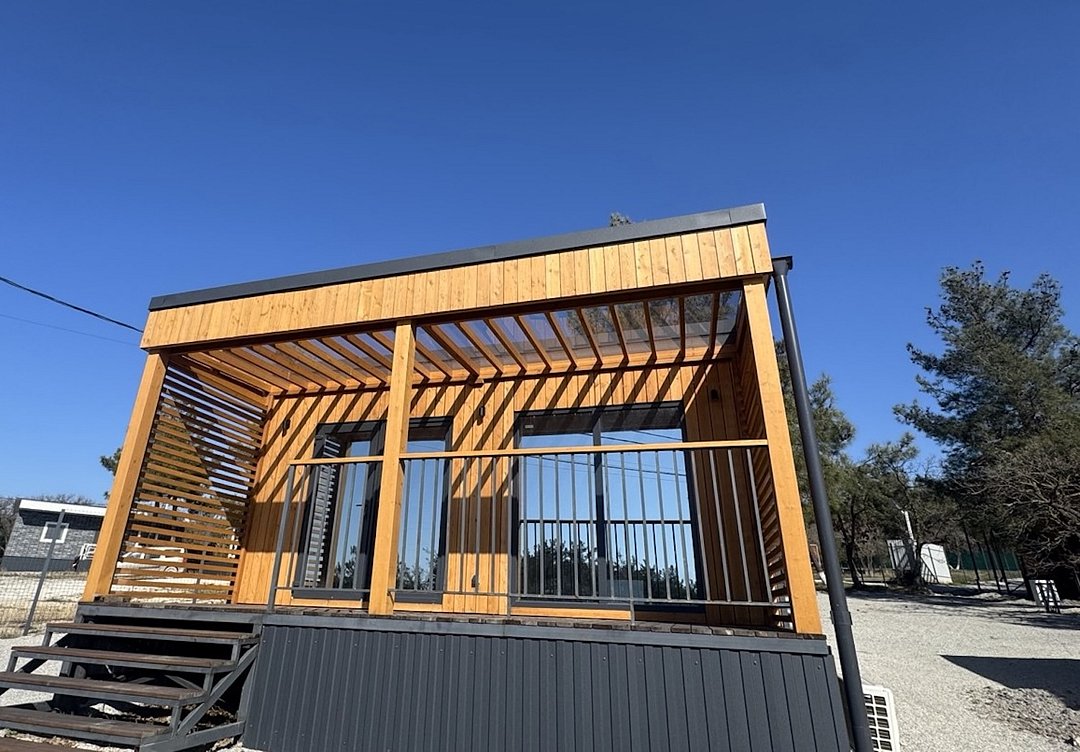 Двухместный домик, ТВ с плоским экраном, шкаф, две тумбочки, зеркало, чайник, холодильник, кондиционер, санузел: душ, раковина, унитаз, полотенца, туалетные принадлежности, на веранде столик со стульями.