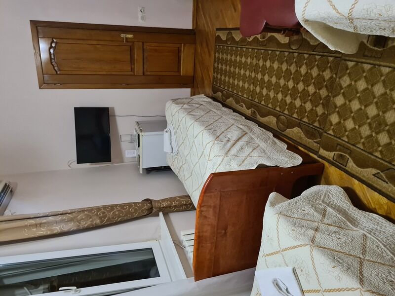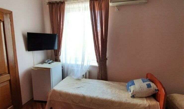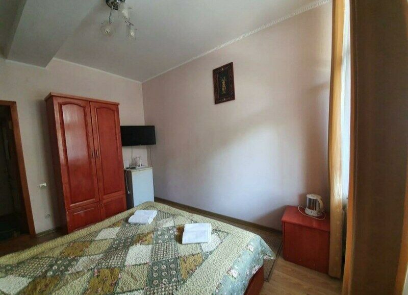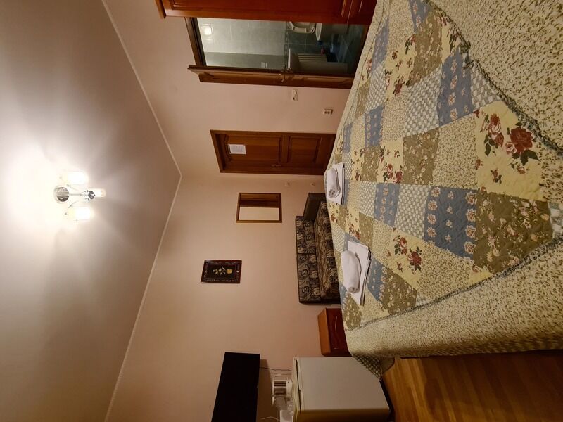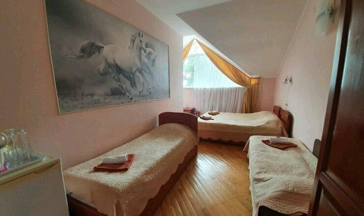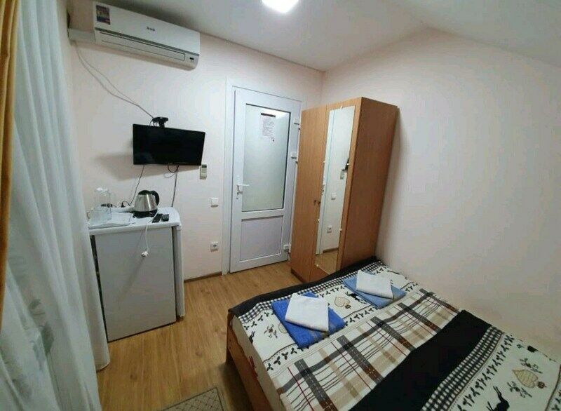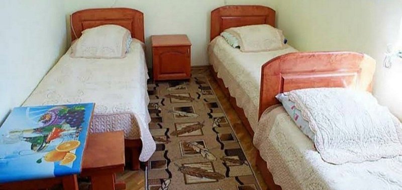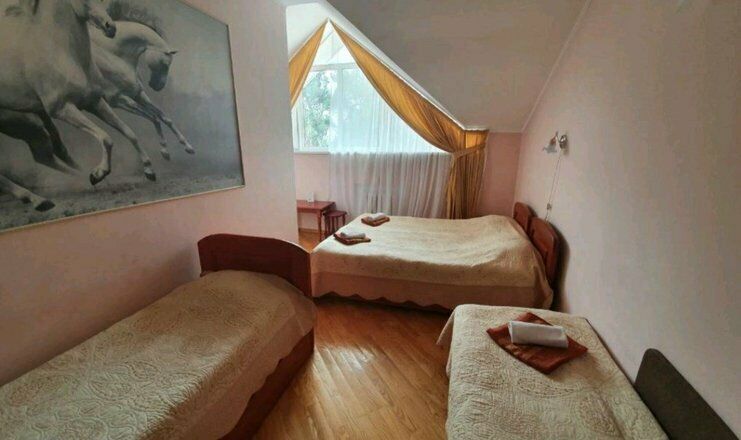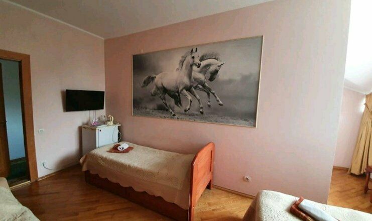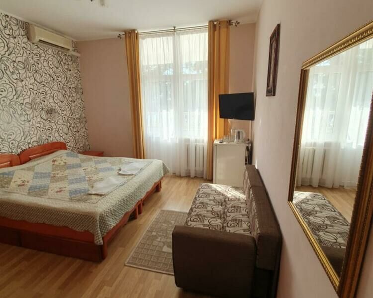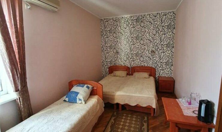 Кровать двуспальная, две кровати односпальные, тумбочки прикроватные, шкаф, журнальный стол, холодильник, кондиционер, телевизор, чайник, санузел (душ+туалет)