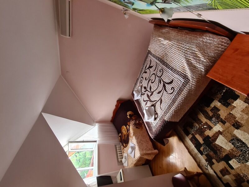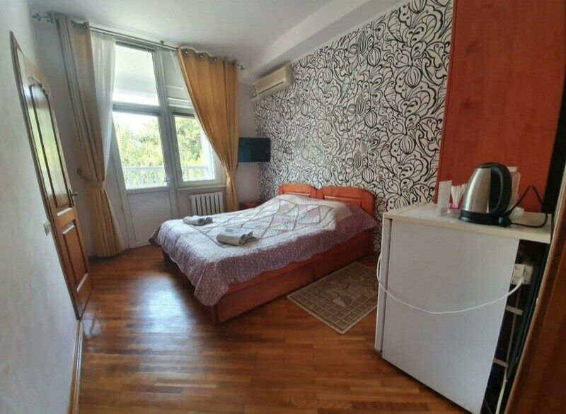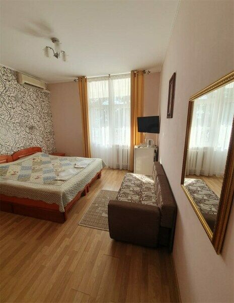 Кровать двуспальная большая, диван-кровать, тумбочки прикроватные, шкаф, журнальный стол, холодильник, кондиционер, телевизор, чайник, санузел (душ+туалет), балкон