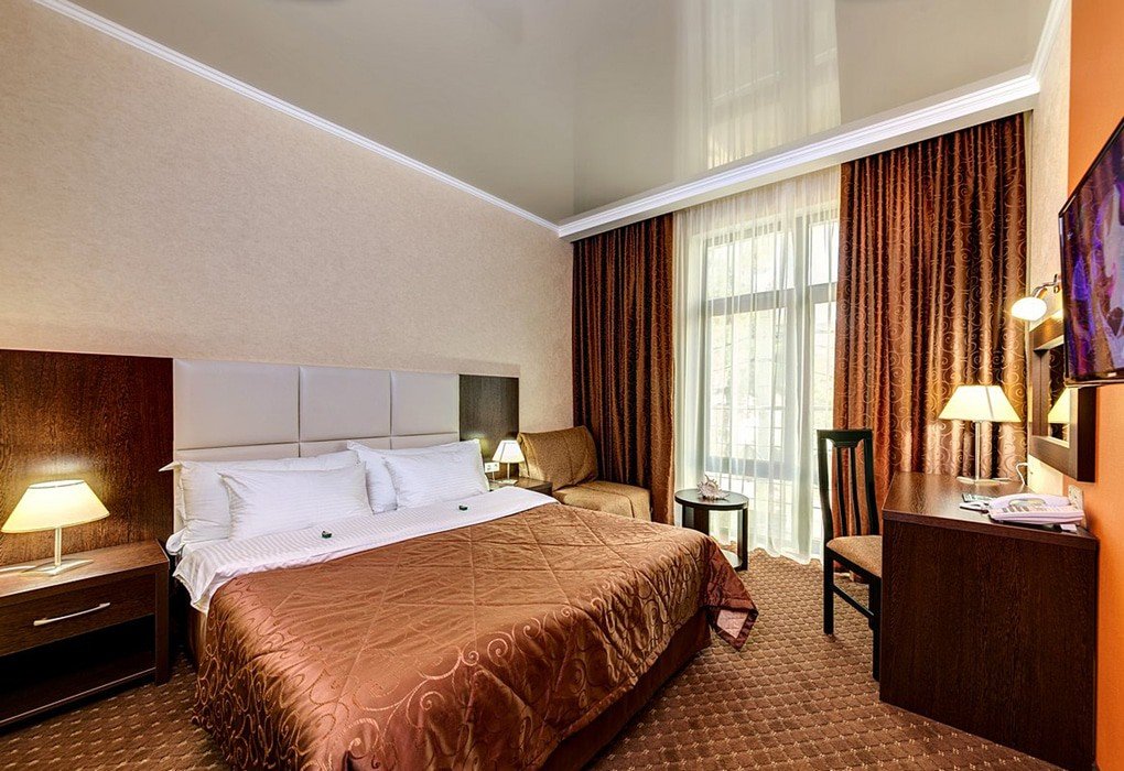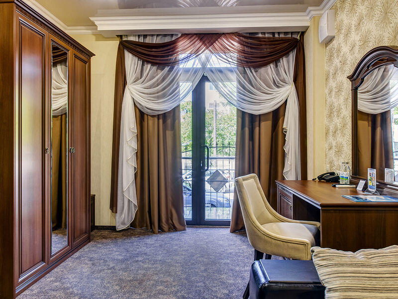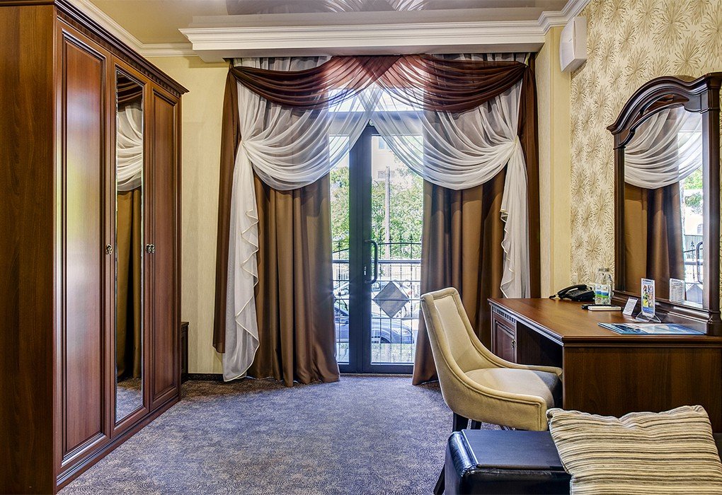 В отеле предусмотрены различные варианты номеров: от Стандарт с балконом и без до двухкомнатных Люксов. При этом набор мебели и услуг примерно одинаковый, только в номере «Люкс» находится мягкая мебель. Для ценителей роскоши в 2018 году появились еще две категории номеров: Студия Делюкс и Люкс 2-местный 2-комнатный Эксклюзив. Номера площадью 43 кв.м. выполнены в оригинальном дизайнерском исполнении. Для гостей предоставляются услуги: заказ такси и экскурсий, прачечная, прокат ноутбука.