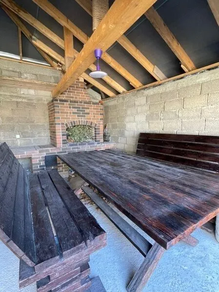 Во дворе под навесом расположена зона барбекю, а также имеется общая кухня со всеми необходимыми принадлежностями для приготовления и приема пищи.