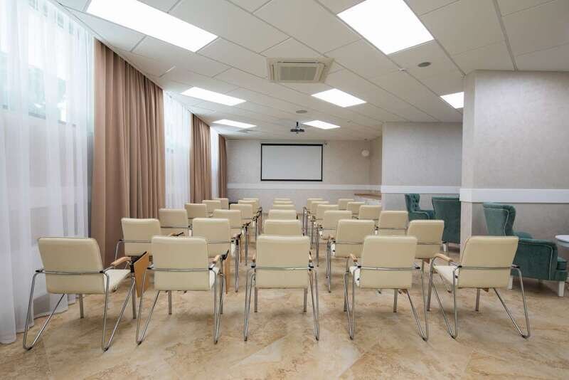 Современный конференц-зал вместимостью до 60 человек оснащен комфортабельной мебелью, необходимым презентационным оборудованием, которое позволит провести Ваше мероприятие на самом высоком уровне.
