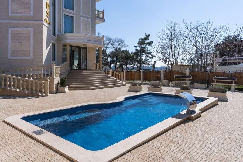 - С бассейном и собственным пляжем