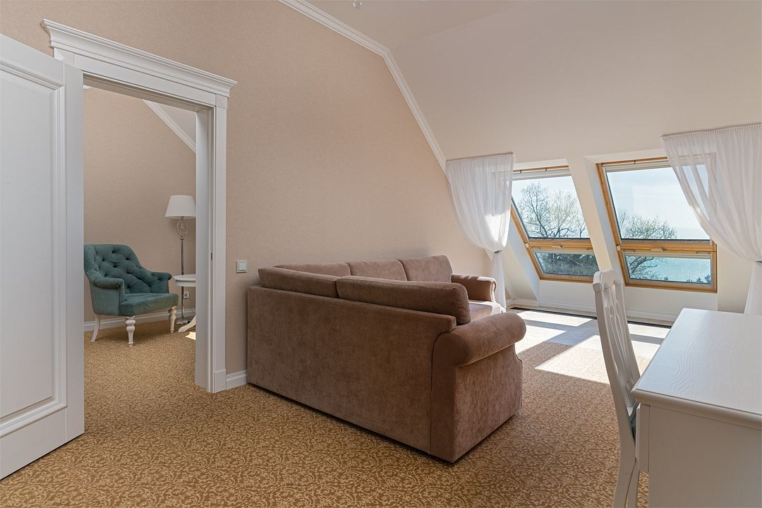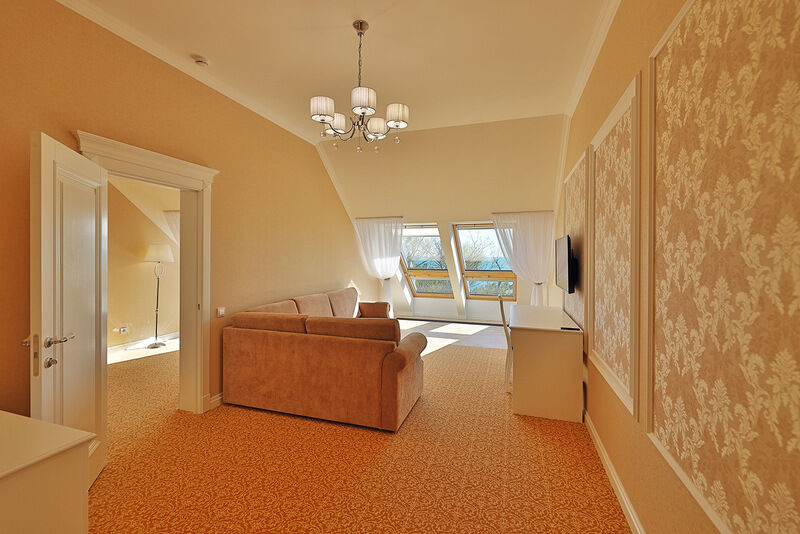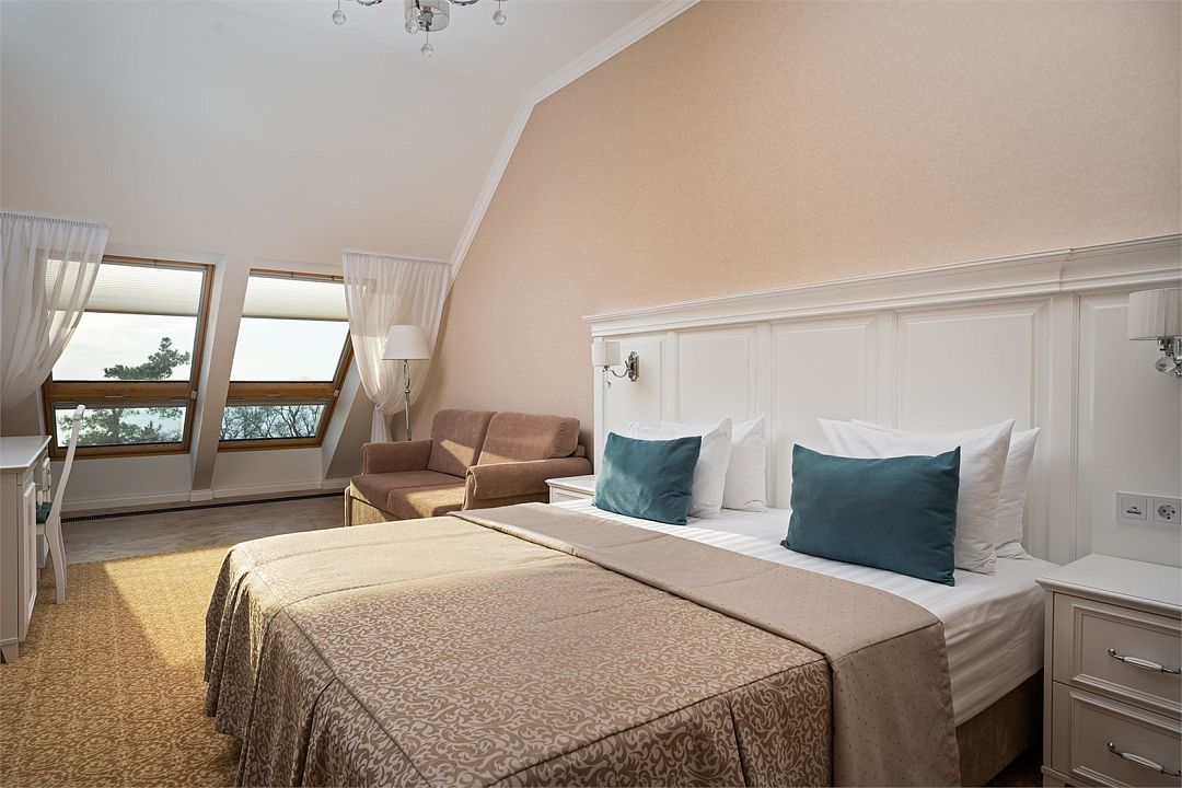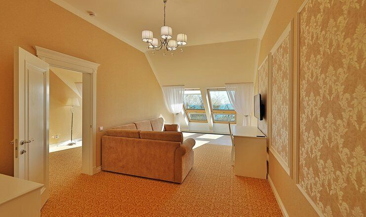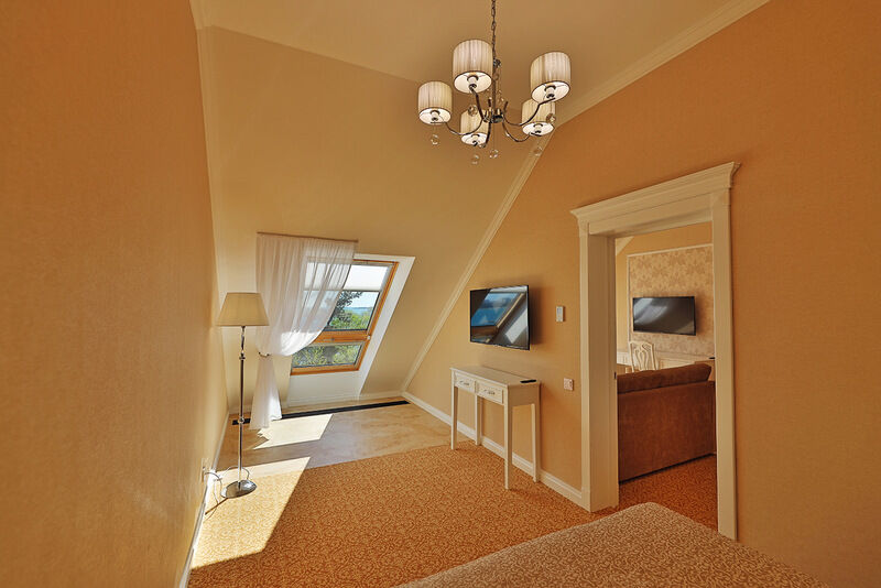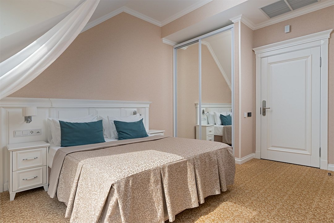 Двухкомнатный номер на 4 мансардном этаже, площадью от 45 кв.м. В спальне комфортная двуспальная кровать, в гостиной раскладной диван, гардеробная с сейфом, гладильной доской и утюгом, ванная комната с феном, душевой кабиной, всей необходимой косметикой, косметическое зеркало с подсветкой.Услуги и удобства