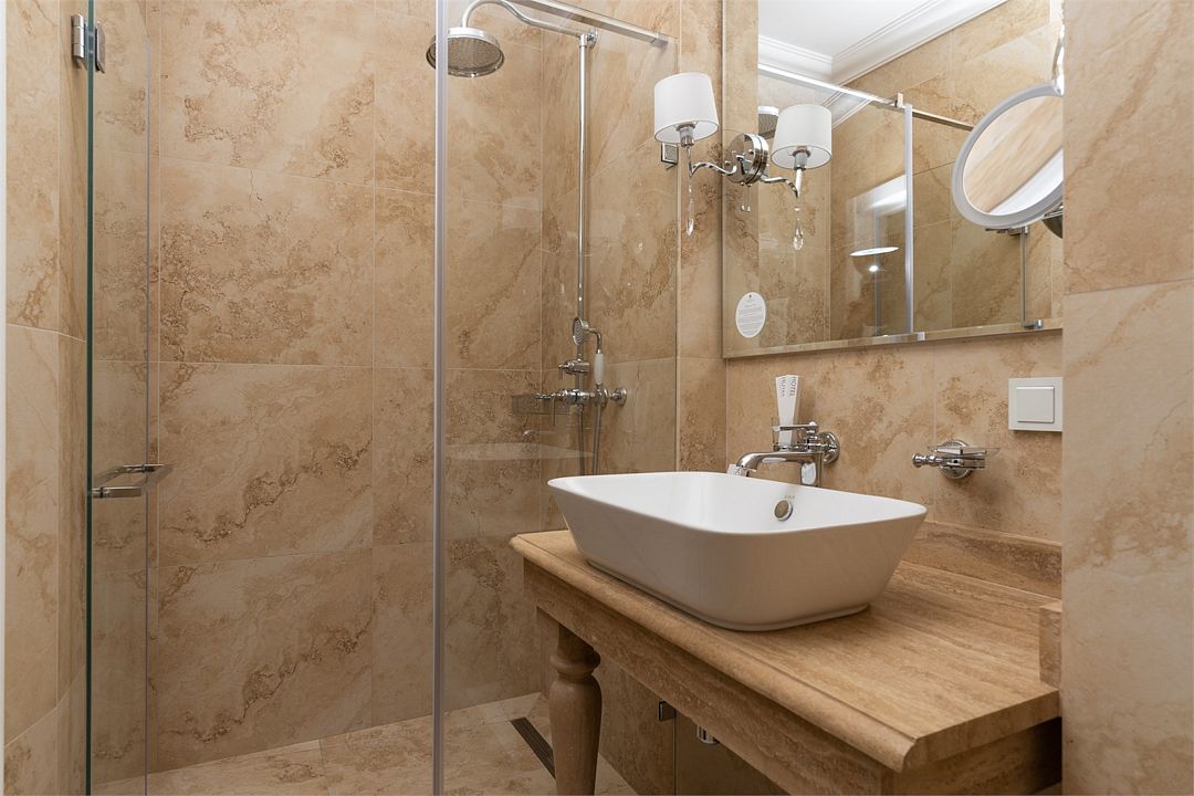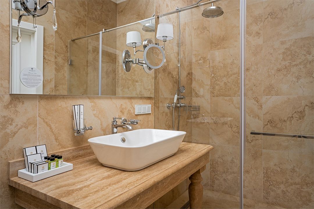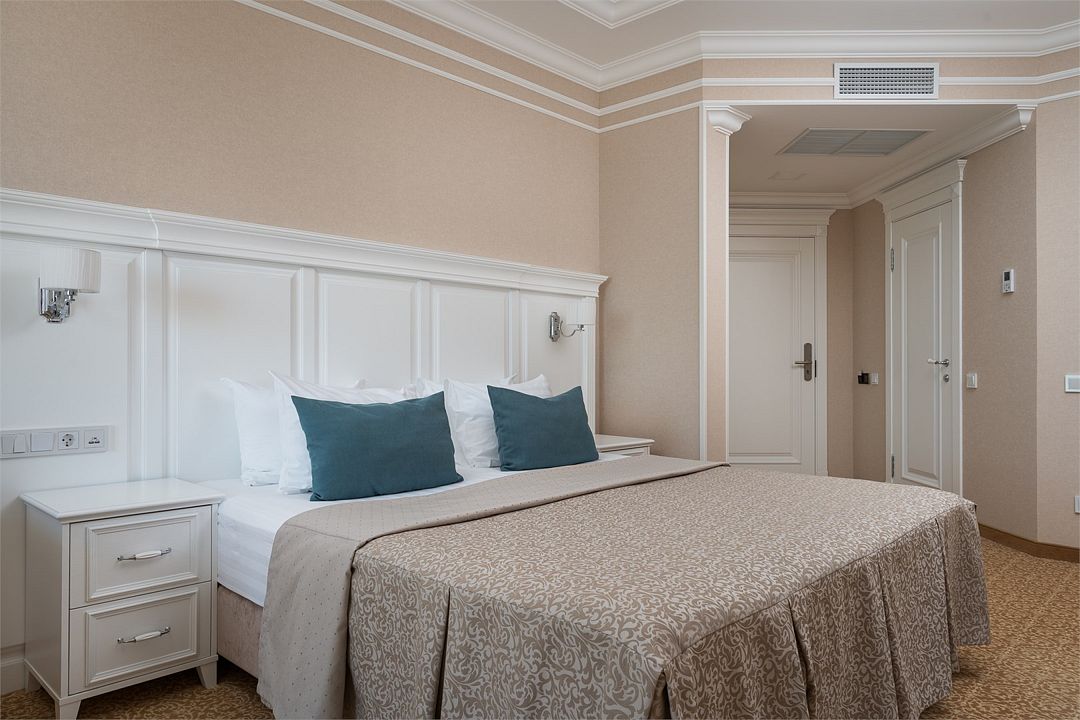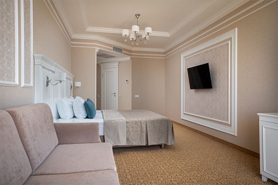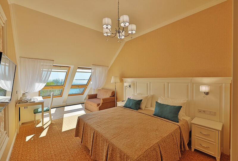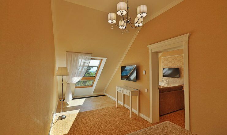 Двухкомнатный номер на 4 мансардном этаже, площадью от 45 кв.м. В спальне комфортная двуспальная кровать, в гостиной раскладной диван, гардеробная с сейфом, гладильной доской и утюгом, ванная комната с феном, душевой кабиной, всей необходимой косметикой, косметическое зеркало с подсветкой.Услуги и удобства