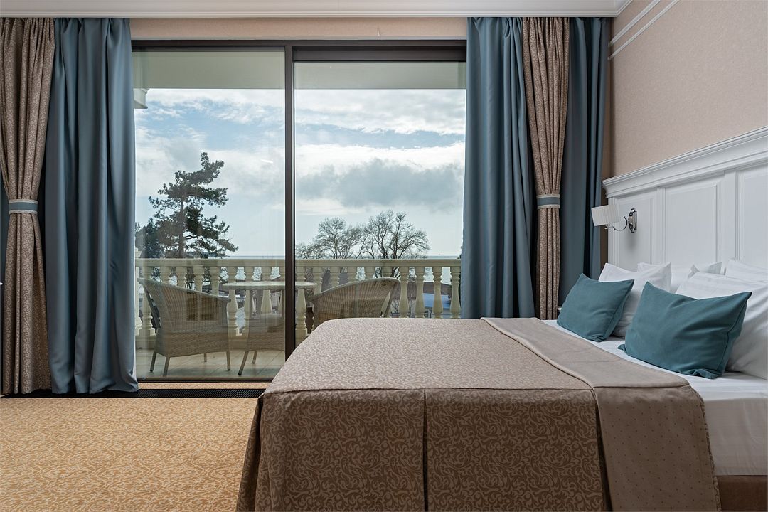 Однокомнатный номер на 3 этаже с видом на море, площадью 30 кв.м. с балконом. Просторная двуспальная кровать или две односпальные кровати, раскладной диван или кресло-кровать, гардеробная с сейфом, гладильной доской и утюгом, ванная комната с феном, душевой кабиной, всей необходимой косметикой, косметическое зеркало с подсветкой, необходимый набор полотенец для каждого гостя, а так же халат и тапочки!Услуги и удобства