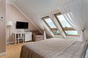 Однокомнатный номер на 4 мансардном этаже, площадью 30 кв.м. без балкона. Просторная двуспальная кровать или две односпальные кровати, раскладной диван или кресло-кровать, гардеробная с сейфом, гладильной доской и утюгом, ванная комната с феном, душевой кабиной, всей необходимой косметикой, косметическое зеркало с подсветкой, необходимый набор полотенец для каждого гостя, а так же халат и тапочки!Услуги и удобства