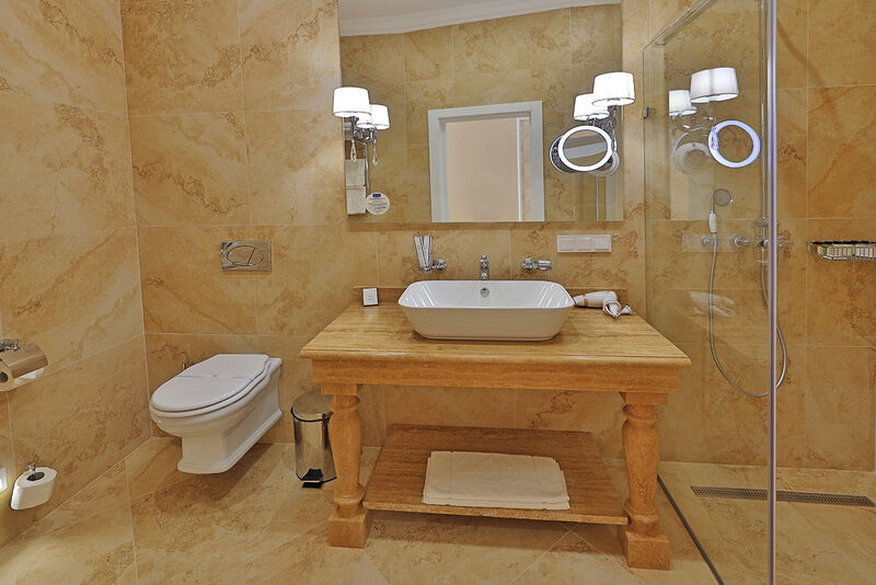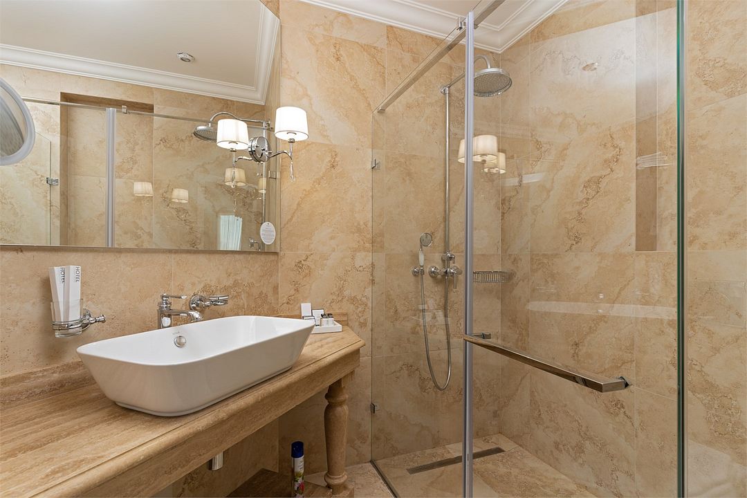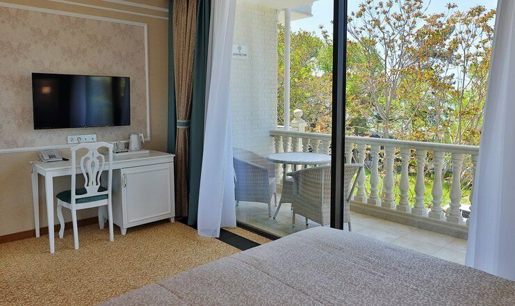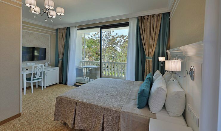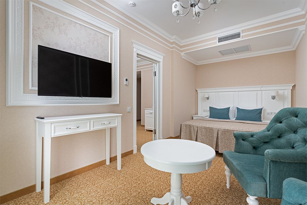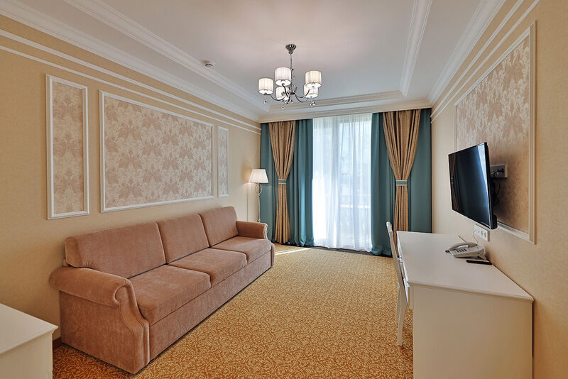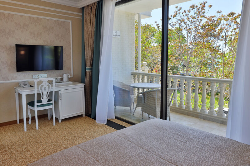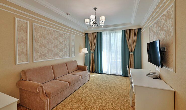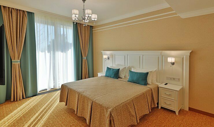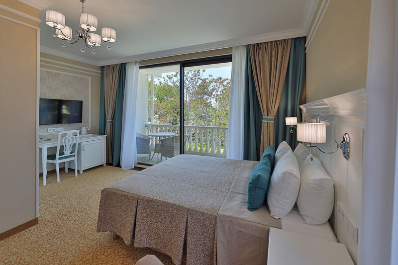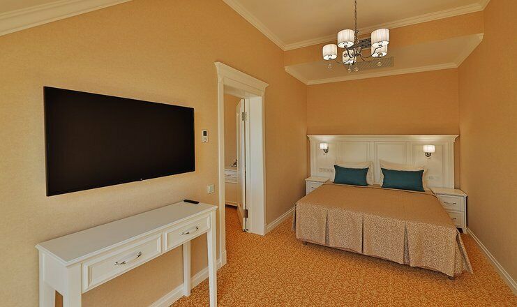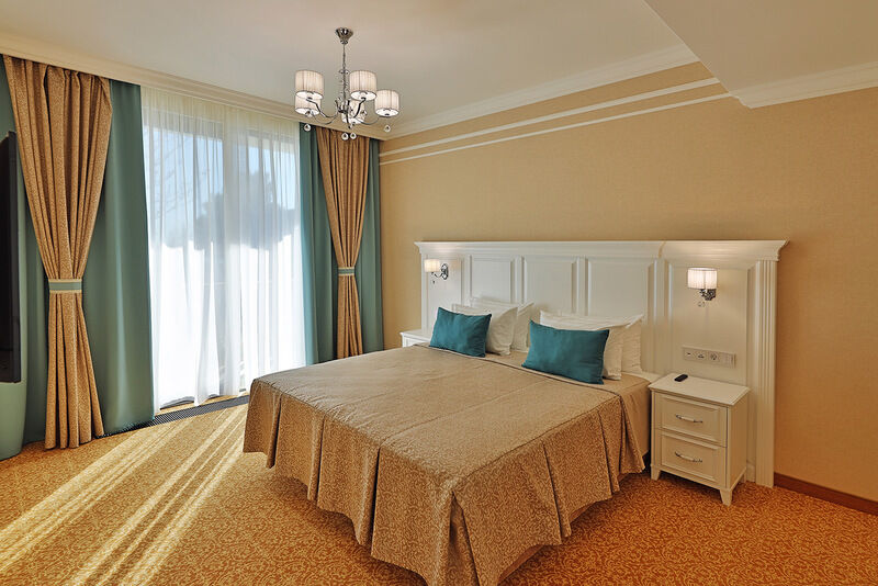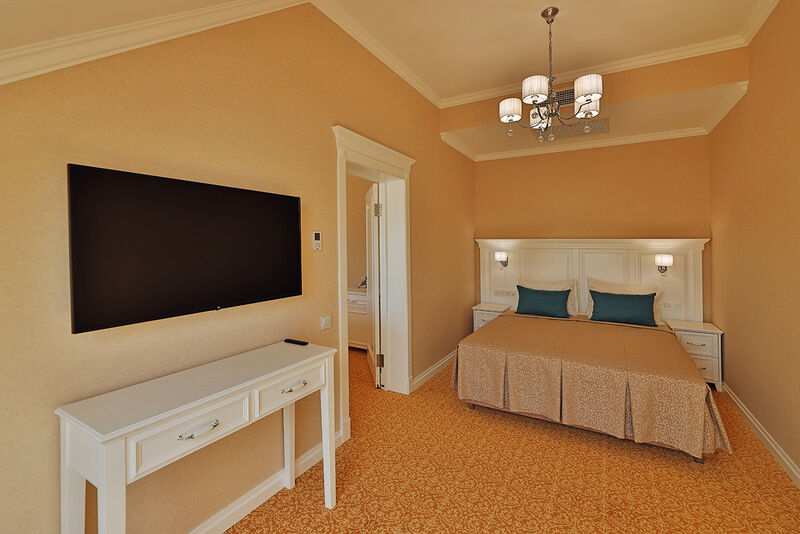 Двухкомнатный номер на 3 этаже с видом на море, площадью от 45 кв.м. В спальне комфортная двуспальная кровать, в гостиной раскладной диван, гардеробная с сейфом, гладильной доской и утюгом, ванная комната с феном, душевой кабиной, всей необходимой косметикой, косметическое зеркало с подсветкой.Услуги и удобства
