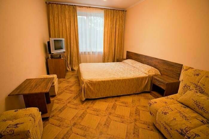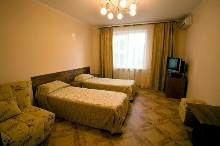 В номере: кровать (одна двуспальная или две полуторные), кресло-трансформер, столик, два пуфика, две прикроватные тумбочки, зеркало, сплит-система, холодильник, телевизор, душ с бесперебойным снабжением горячей и холодной водой, санузел.