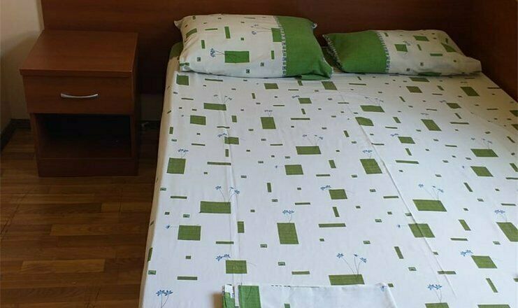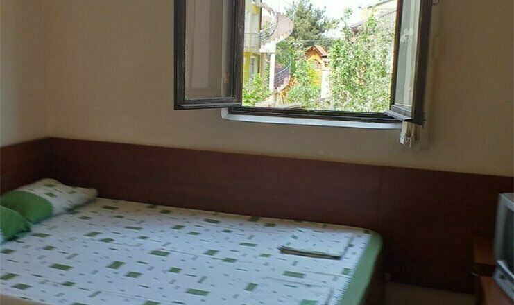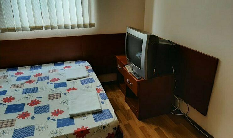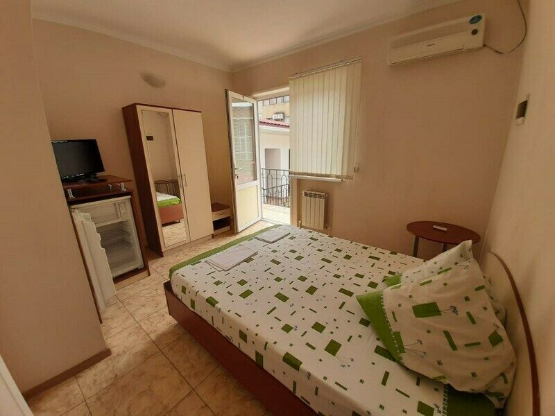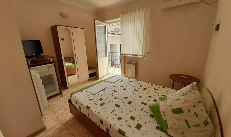 Двуспальная кровать, тумбочки прикроватные, шкаф, холодильник, кондиционер, телевизор, санузел, (душ+туалет)