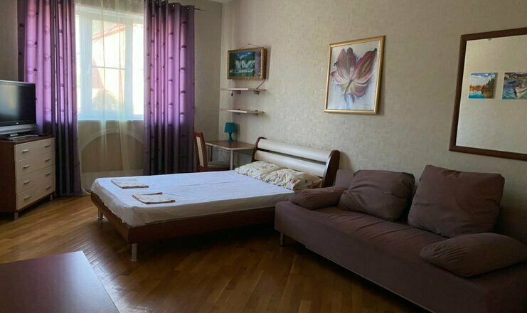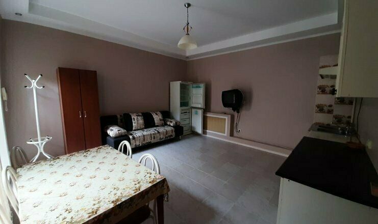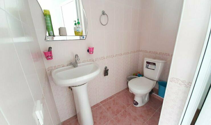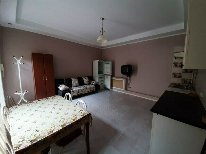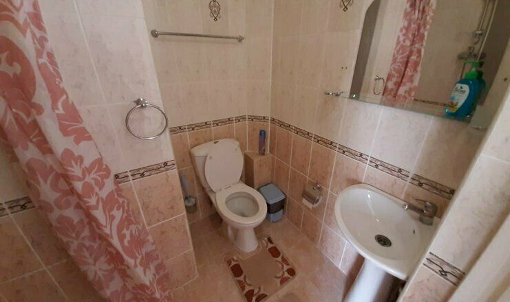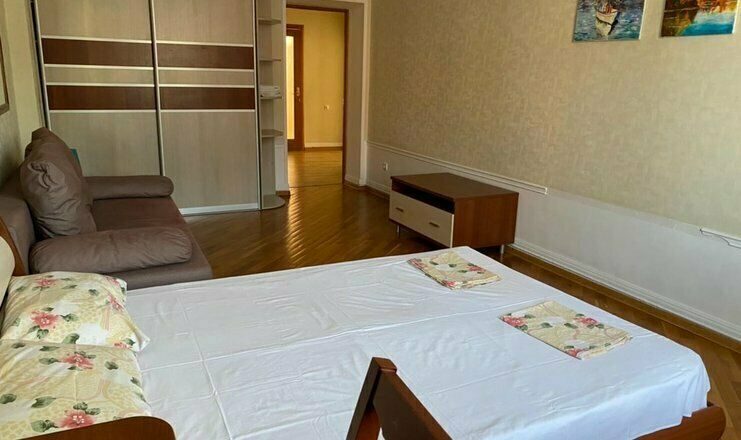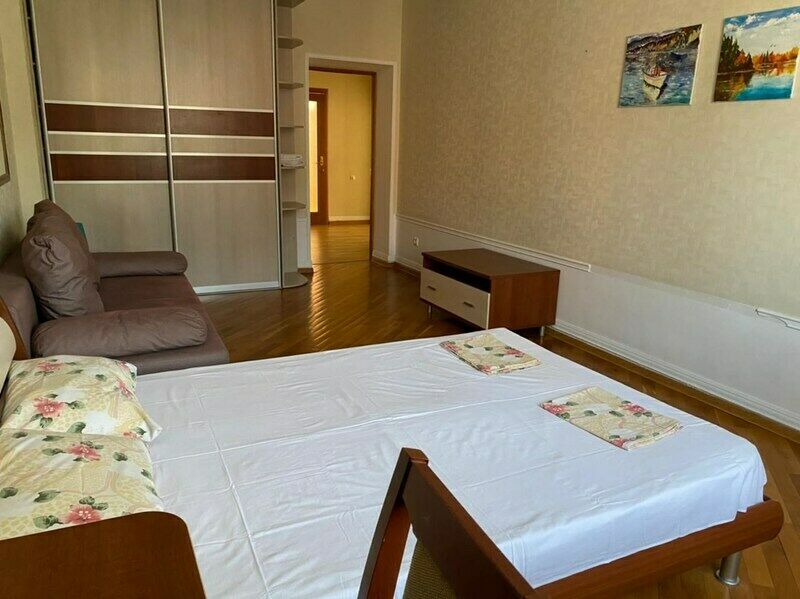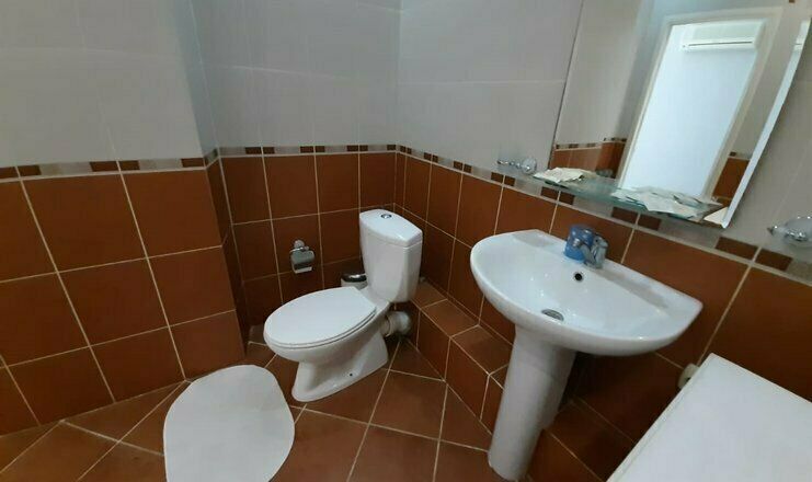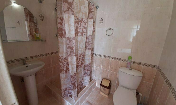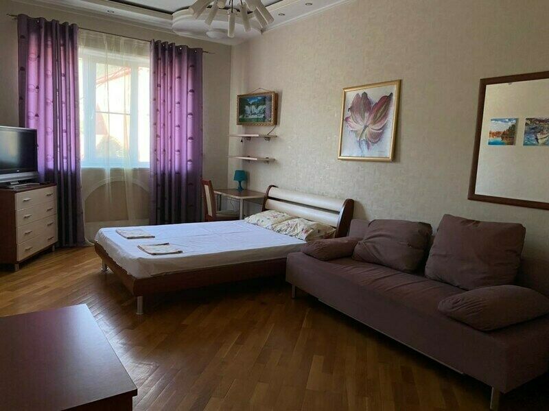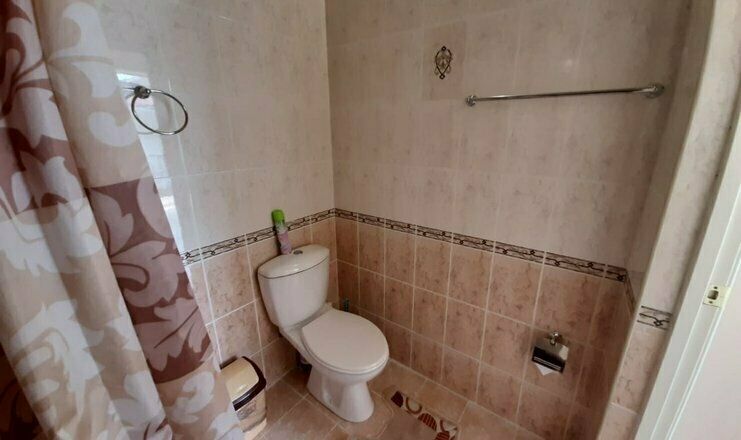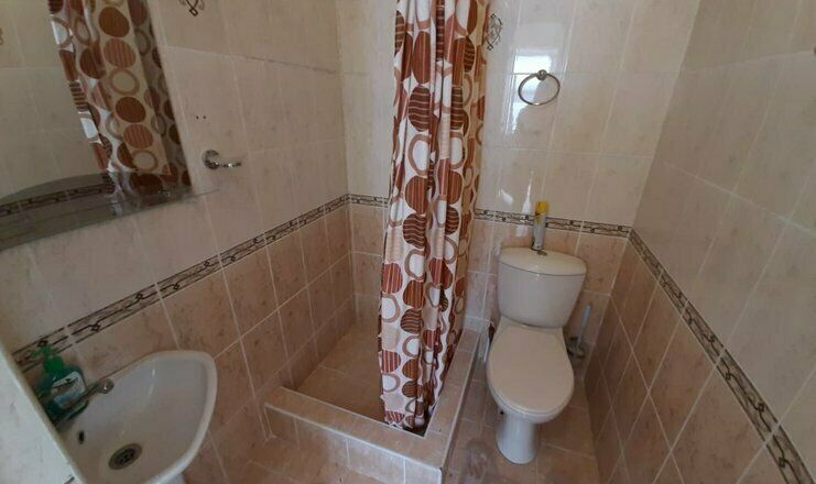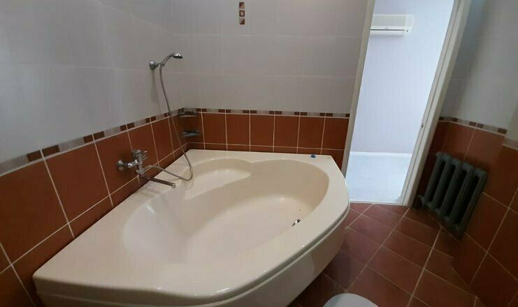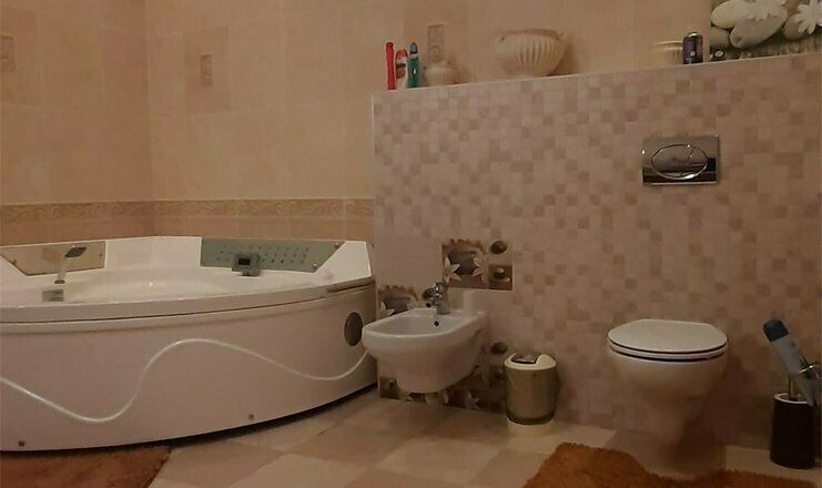 вуспальная кровать, диван, тумбочки прикроватные, шкаф, кондиционер, телевизор, санузел (ванна+туалет) на этаже