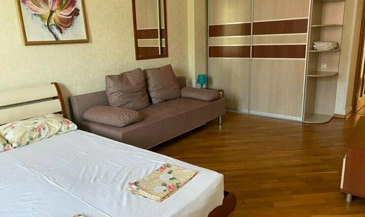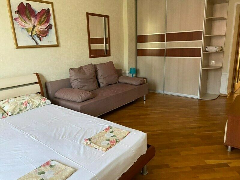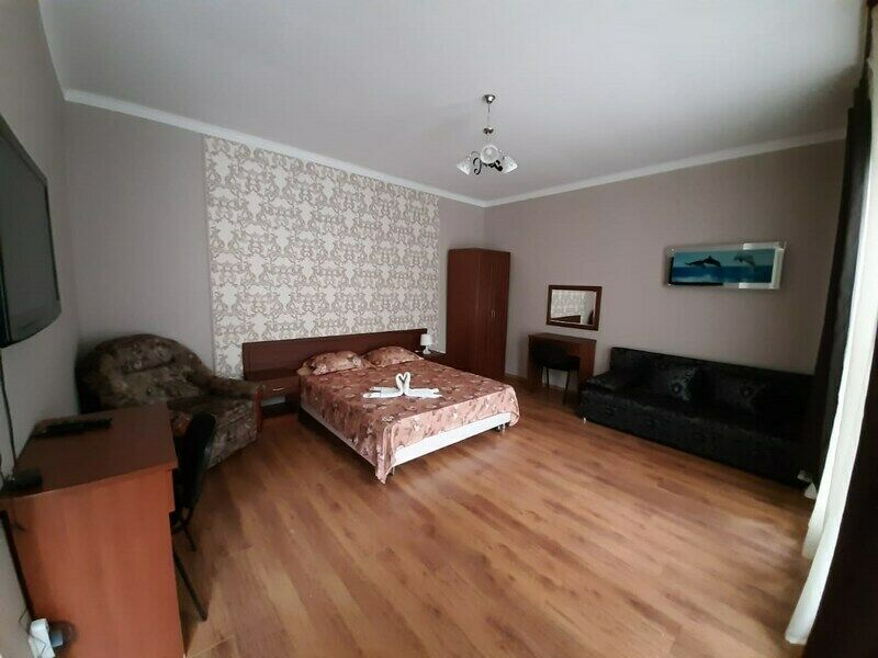 Двуспальная кровать, диван, тумбочки прикроватные, шкаф, холодильник, кондиционер, телевизор, санузел, (душ+туалет)