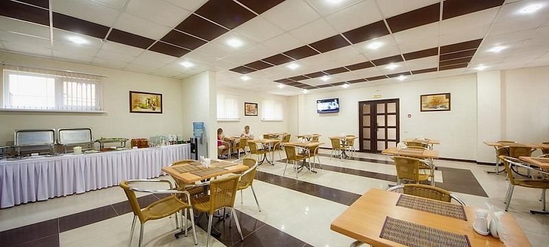 Завтрак сервируется в формате «шведский стол» с обширной фуршетной линией: закуски, горячие блюда, гарниры, салаты, напитки, свежие фрукты и десерты.