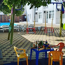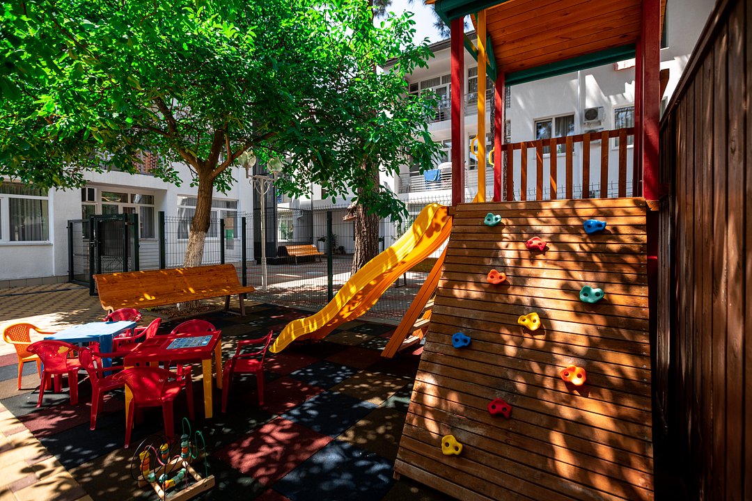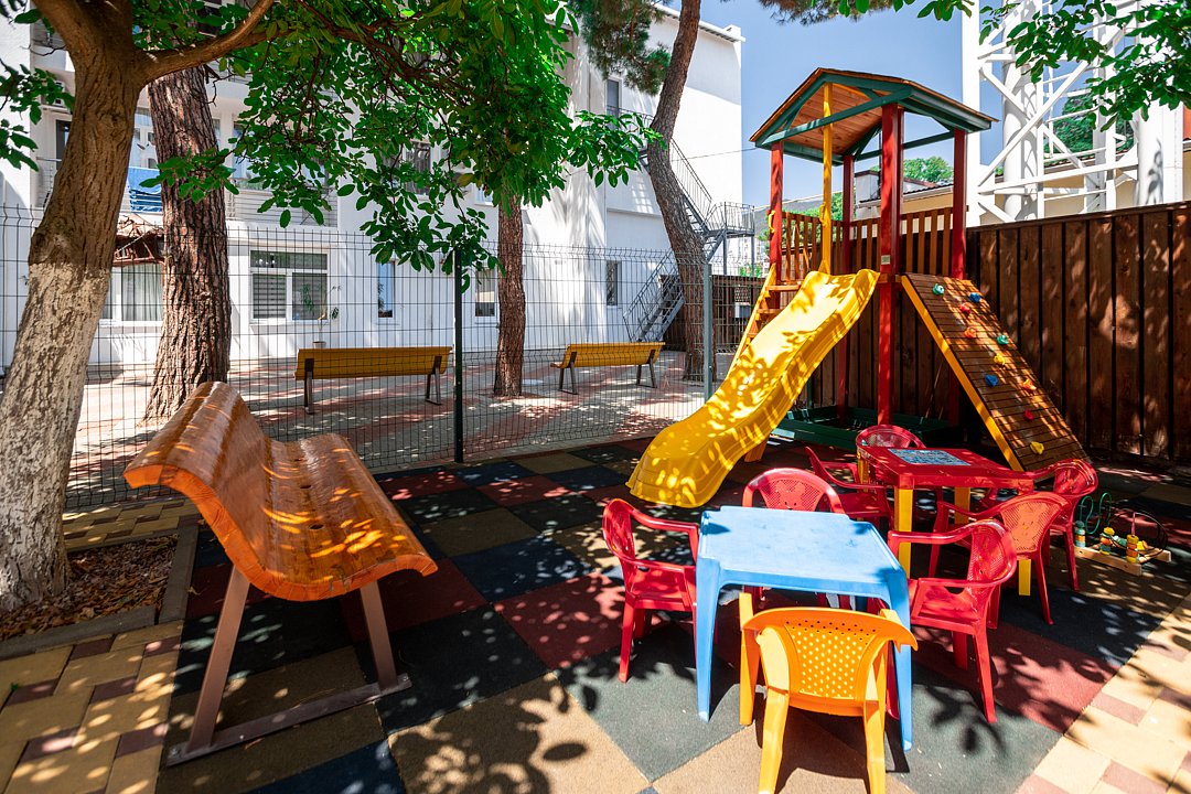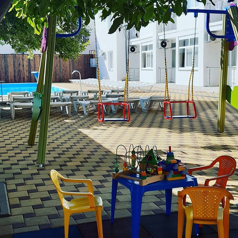 Пансионат «Геленджик» предлагает небольшую, уютную детскую площадку в тени деревьев у бассейна — пространство с мягким противоскользящим покрытием, которое обеспечивает безопасность при активных играх и спокойствие родителей.
